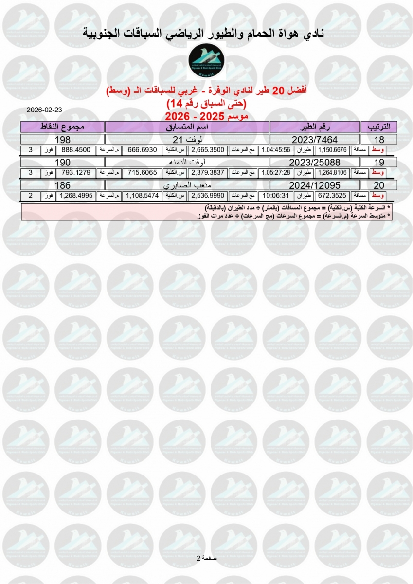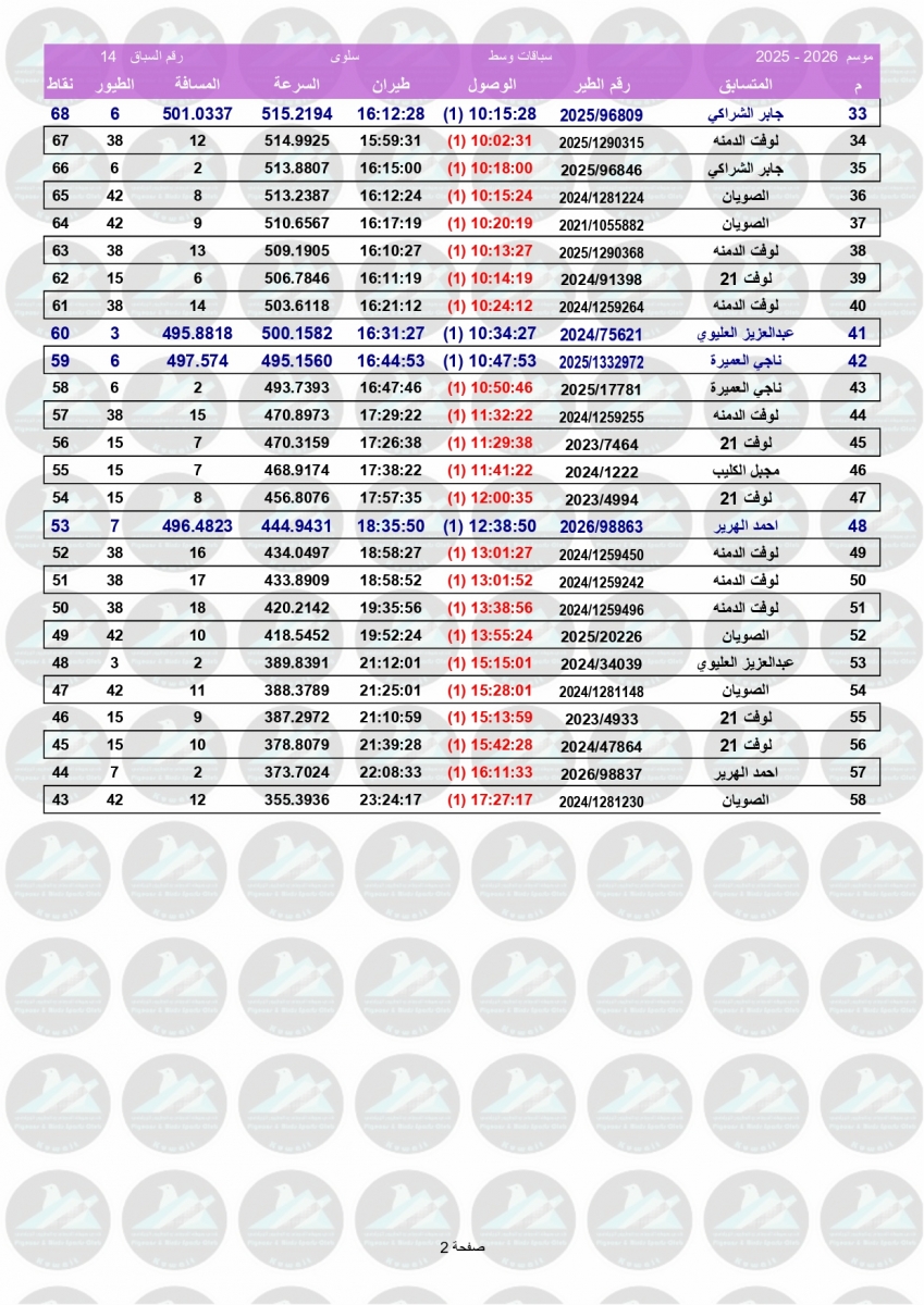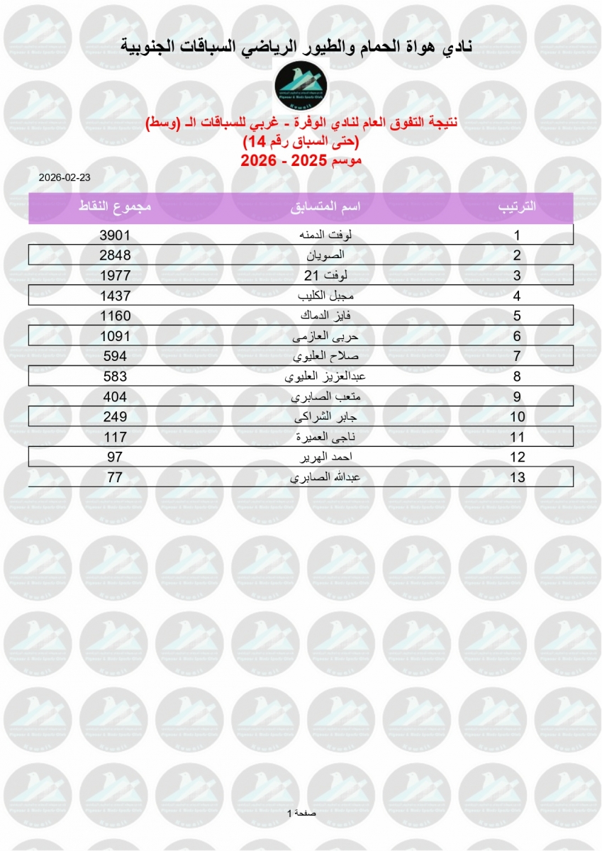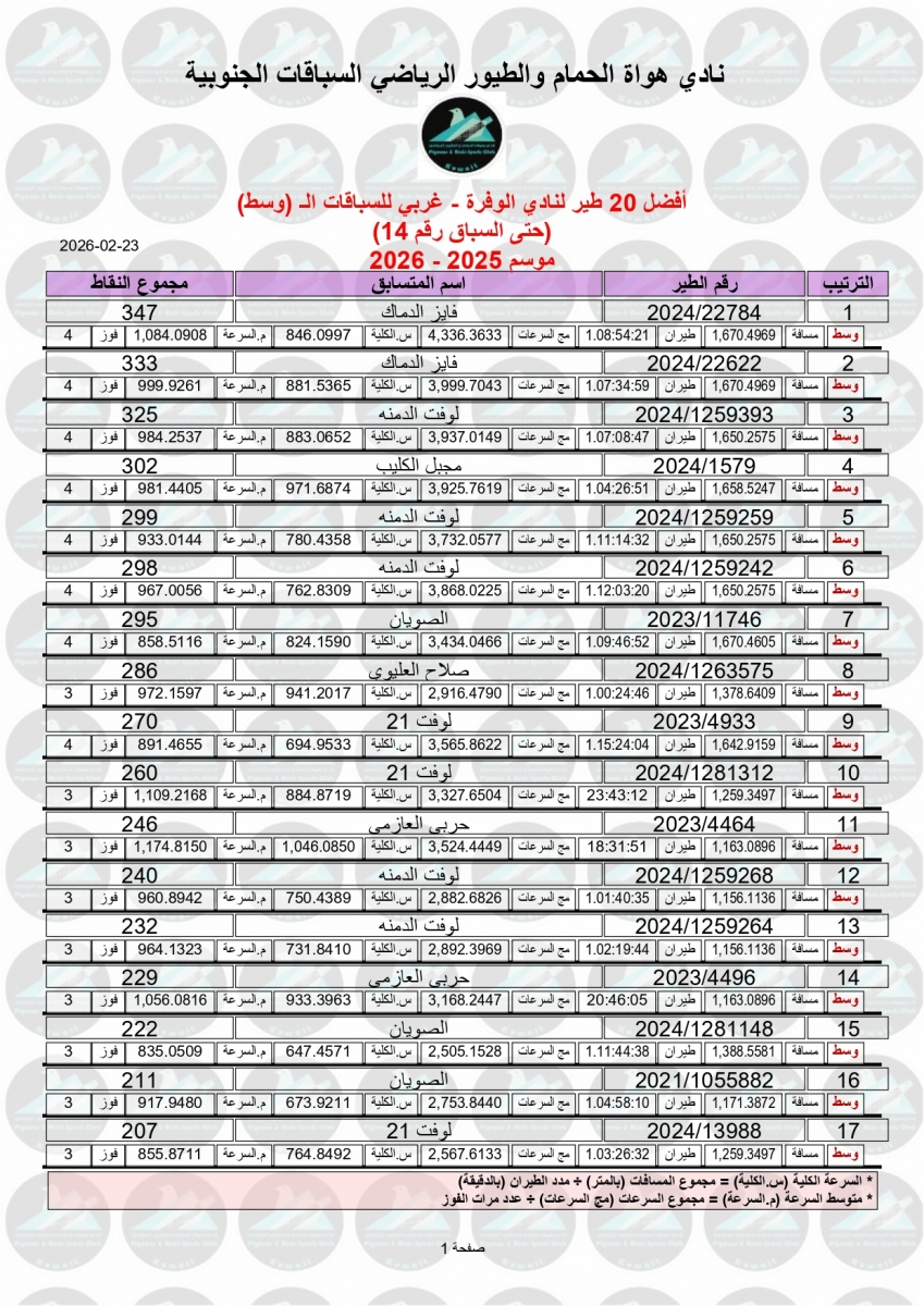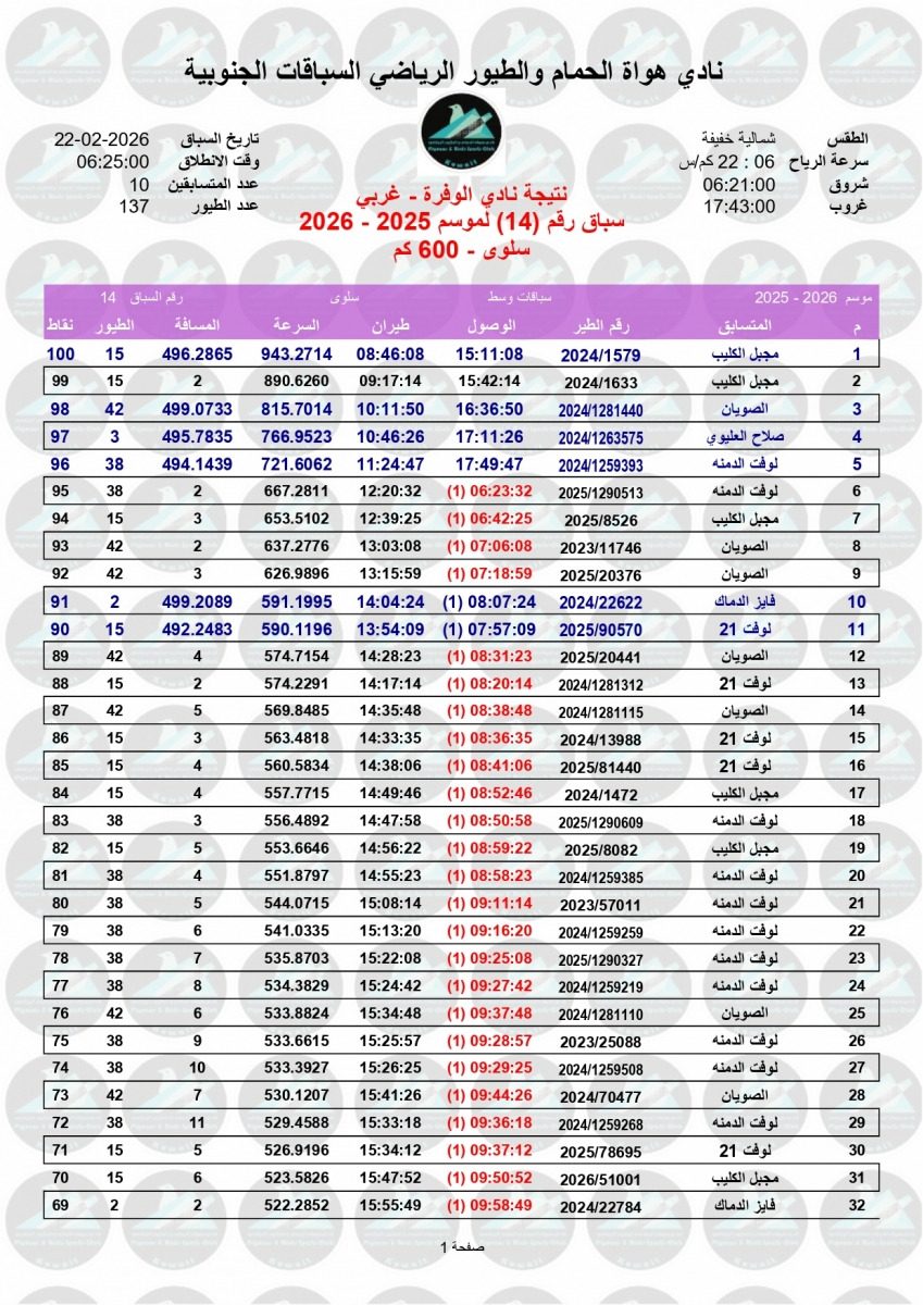 > منتديات الاتحاد الكويتي لسباق حمام الزاجل > منتدي اخبار السباقات > نتائج سباقات الاتحاد الكويتي / Race results > نتيجة السباق الرابع عشر - سلوى 600 كم – لنادي الوفرة غربي