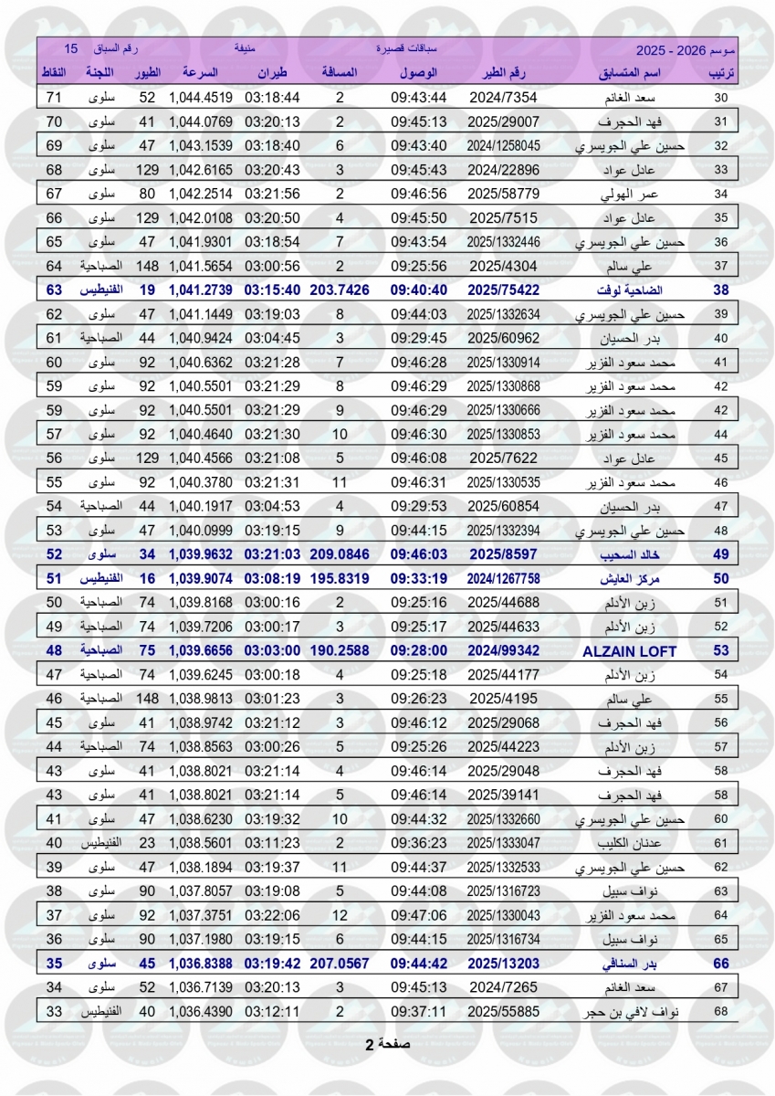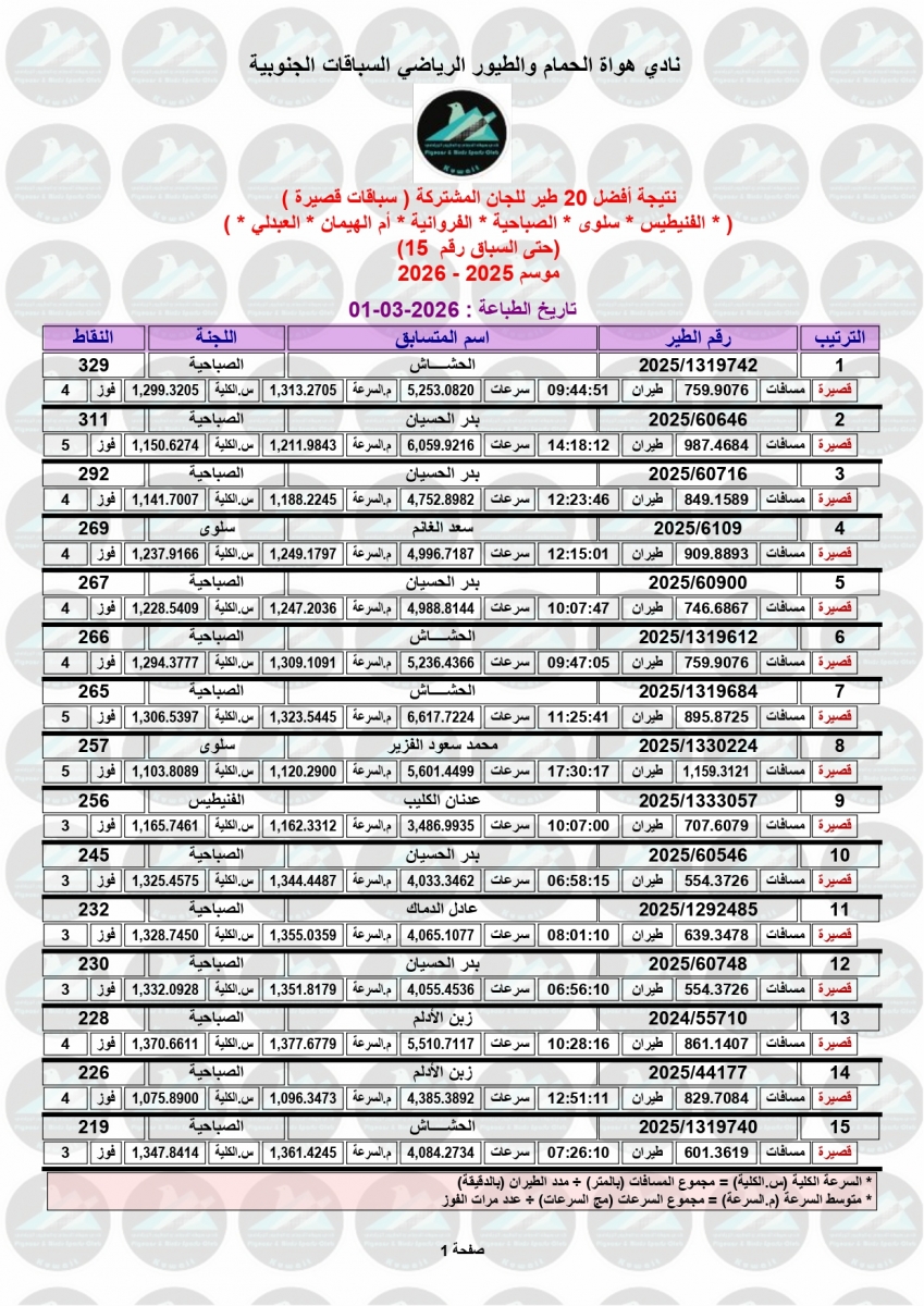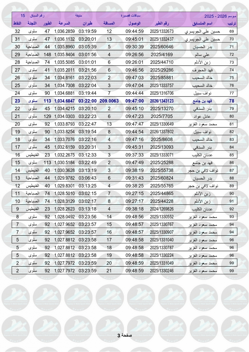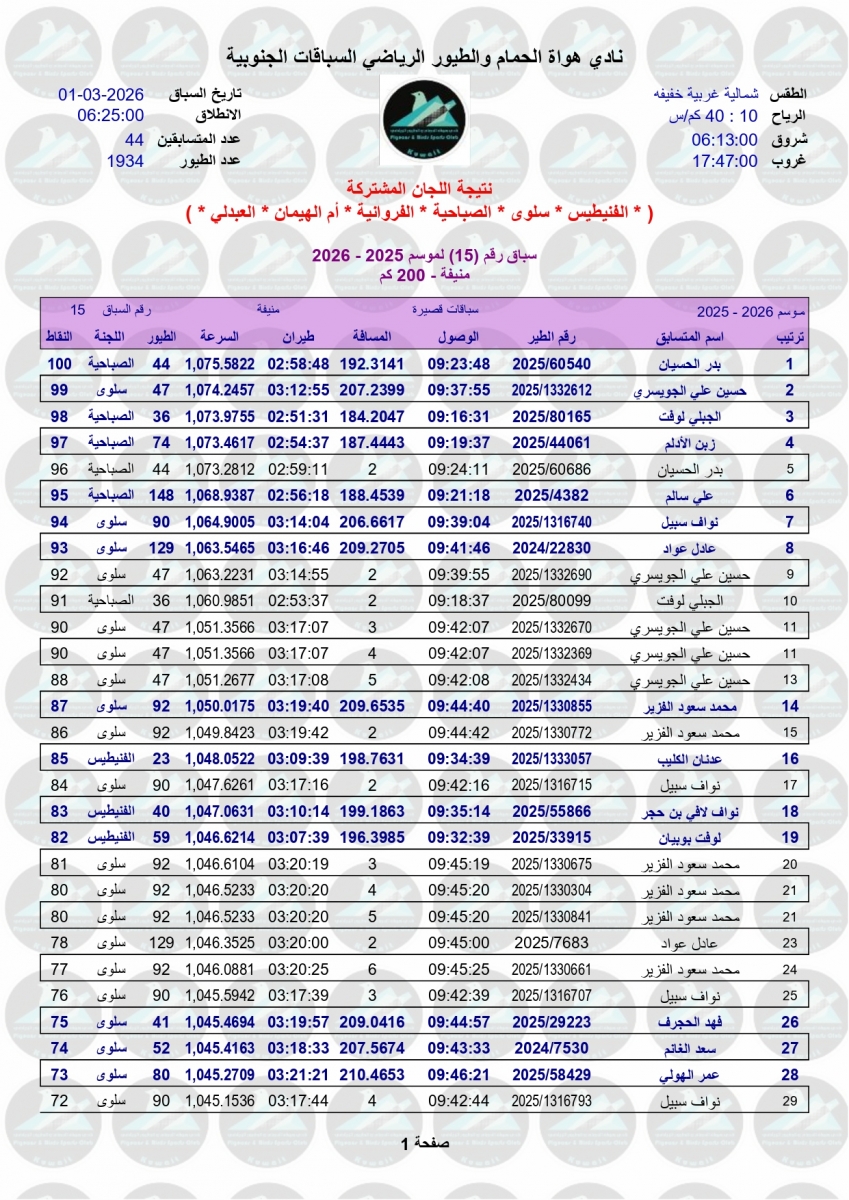 السلام عليكم ورحمة الله وبركاته إليكم نتيجة السباق الخامس عشر – منيفه 200 كم – السباقات المشتركة مبروك الفوز