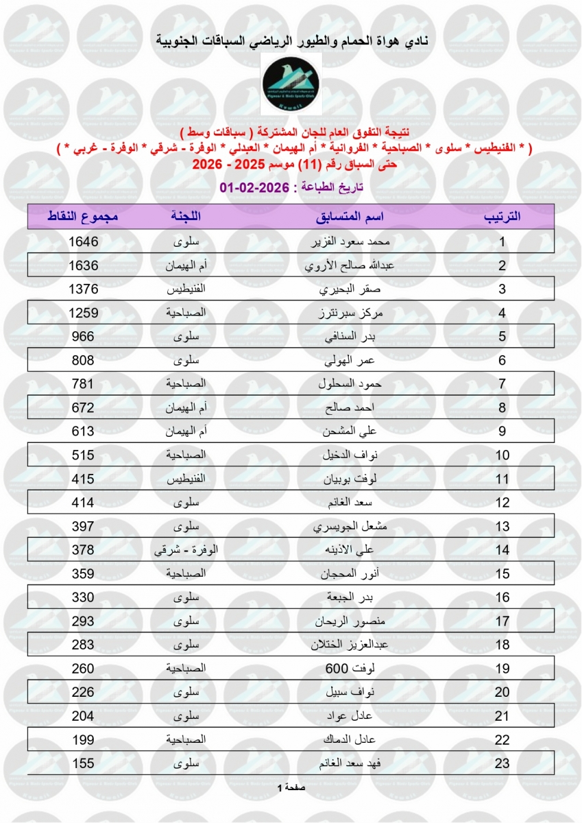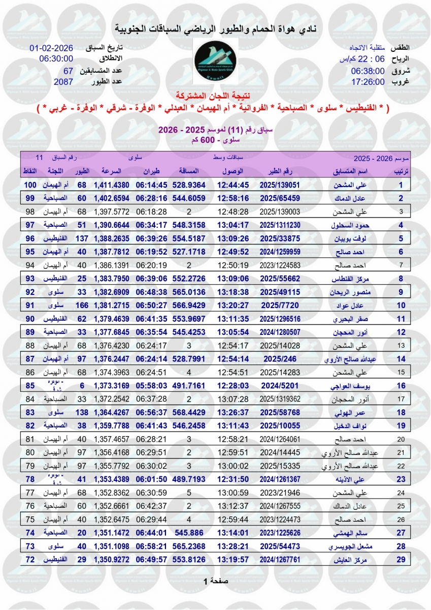 إليكم نتيجة السباق الحادي عشر - سلوى 600 كم - السباقات المشتركة