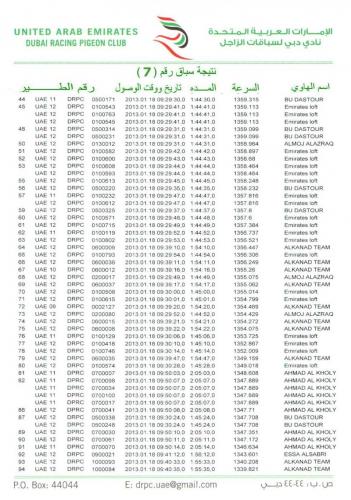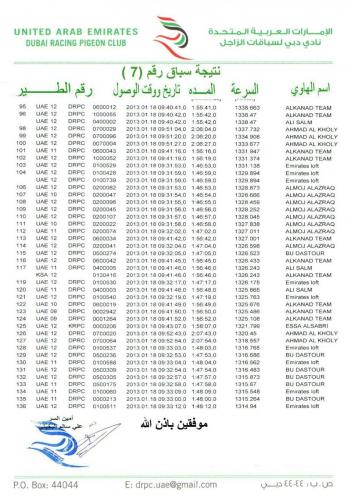 نرفق اليكم نتيجة السباق السابع لنادي دبي لسباقات الزاجل من حقل الرميثا مسافة 150كم المقام يوم الجمعه الموافق 2013/1/18م ونبارك للاخ حسن حبيب الفوز بهذا السباق وحظ اوفر للبيقه ان شاءالله