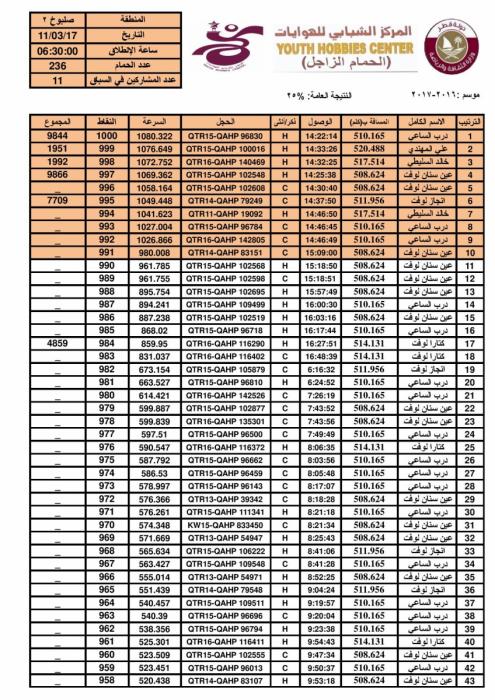 > منتديات الاتحاد الكويتي لسباق حمام الزاجل > أخبار الاتحادات والاندية > اخبار الجمعية القطرية لهواة حمام الزاجل > نتيجة سباق صلبوخ 2 -500 كلم- لموسم 2016-2017