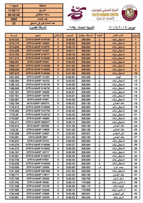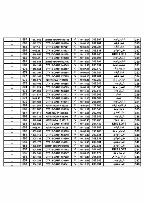 > منتديات الاتحاد الكويتي لسباق حمام الزاجل > أخبار الاتحادات والاندية > اخبار الجمعية القطرية لهواة حمام الزاجل > نتيجة سباق النايفية 3 -210 كلم- لموسم 2016-2017