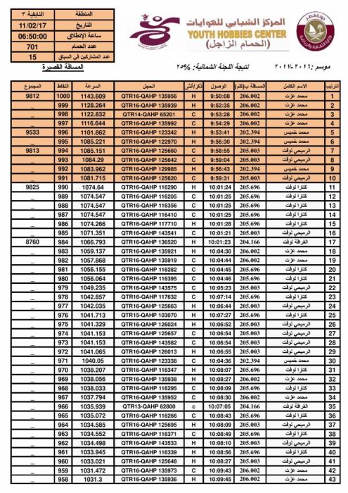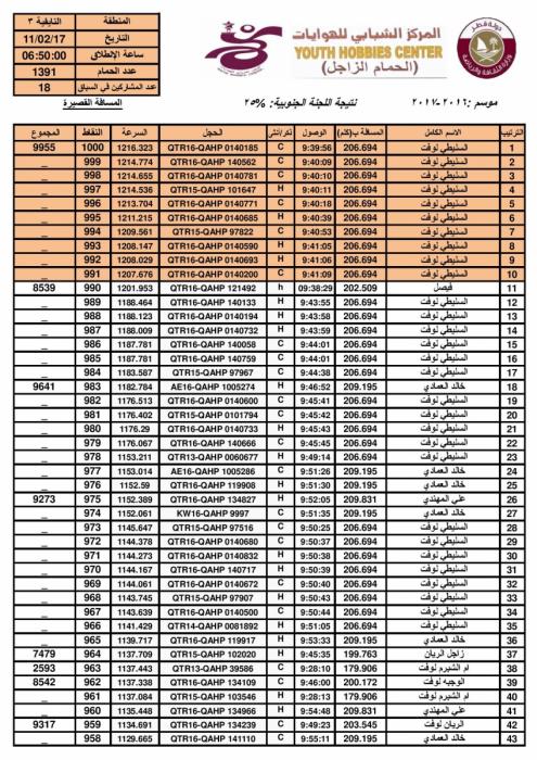 مر السباق في جو معتدل ورياح شمالي ، حيث تمكن الهاوي خالد السليطي من احراز المركز الآول على النتيجة الجنوبية و العامة والهاوي محمد عزت على اللجنة الشمالية . مبروك للفائزين.