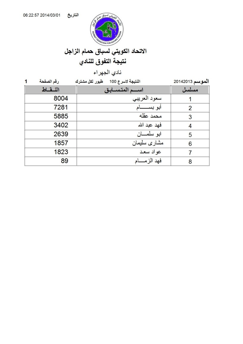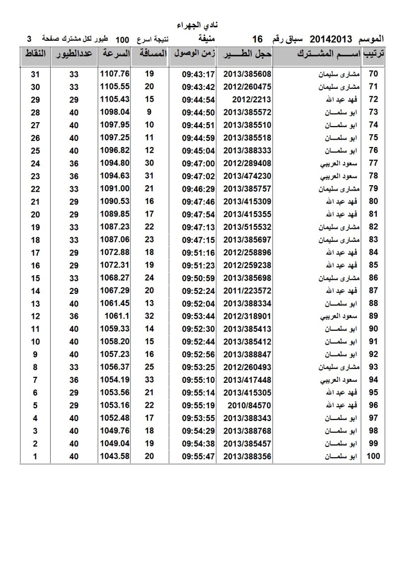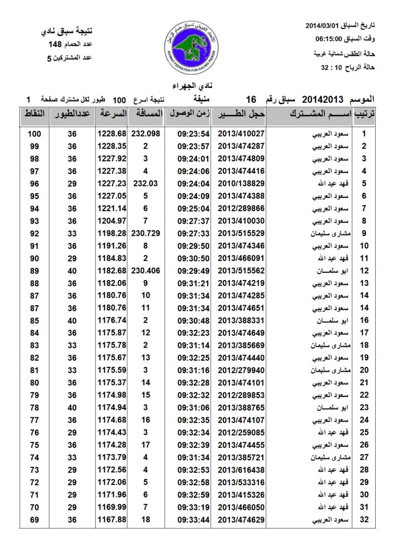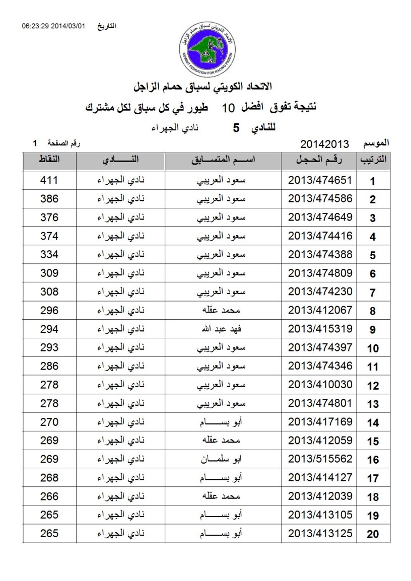 > منتديات الاتحاد الكويتي لسباق حمام الزاجل > منتدي اخبار السباقات > نتائج سباقات الاتحاد الكويتي / Race results > نتيجة 200كم الجهراء منيفه 5
