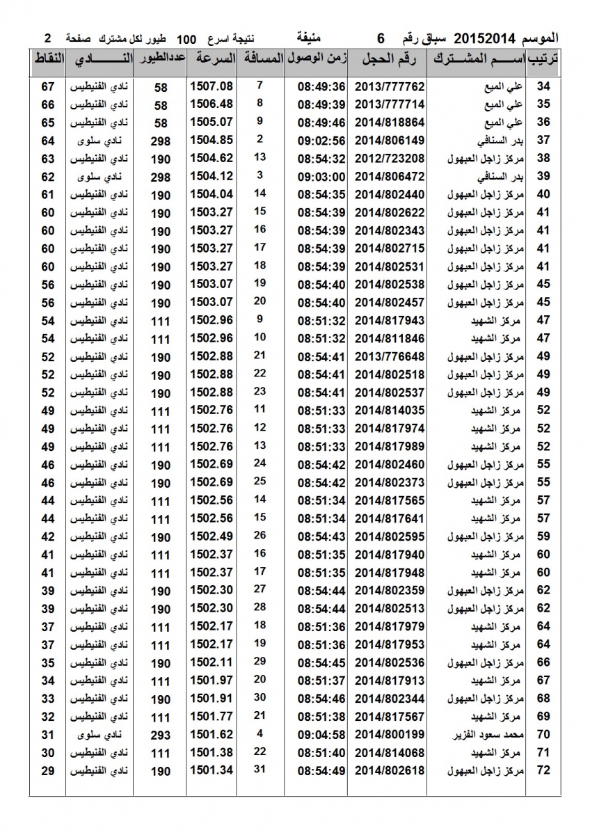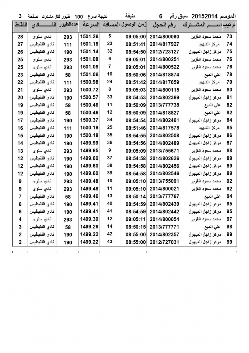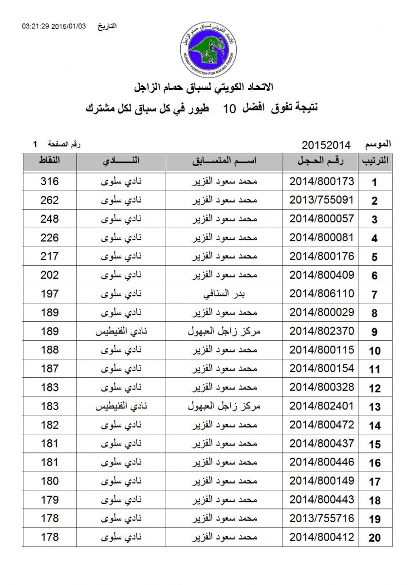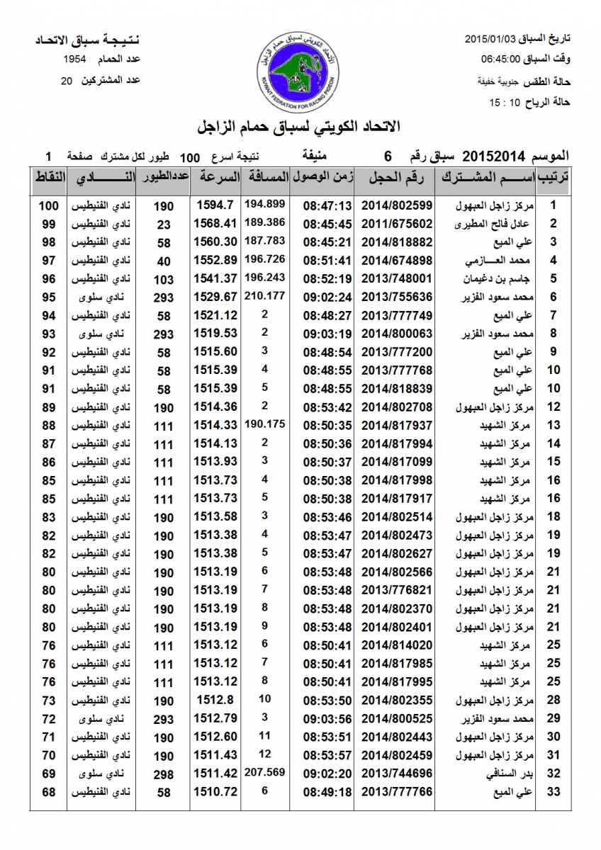 > منتديات الاتحاد الكويتي لسباق حمام الزاجل > منتدي اخبار السباقات > نتائج سباقات الاتحاد الكويتي / Race results > نتيجة الاتحاد - السباق السادس منيفة