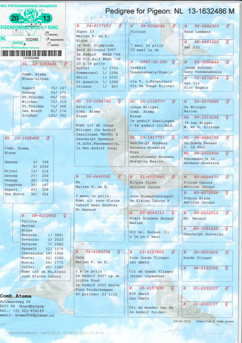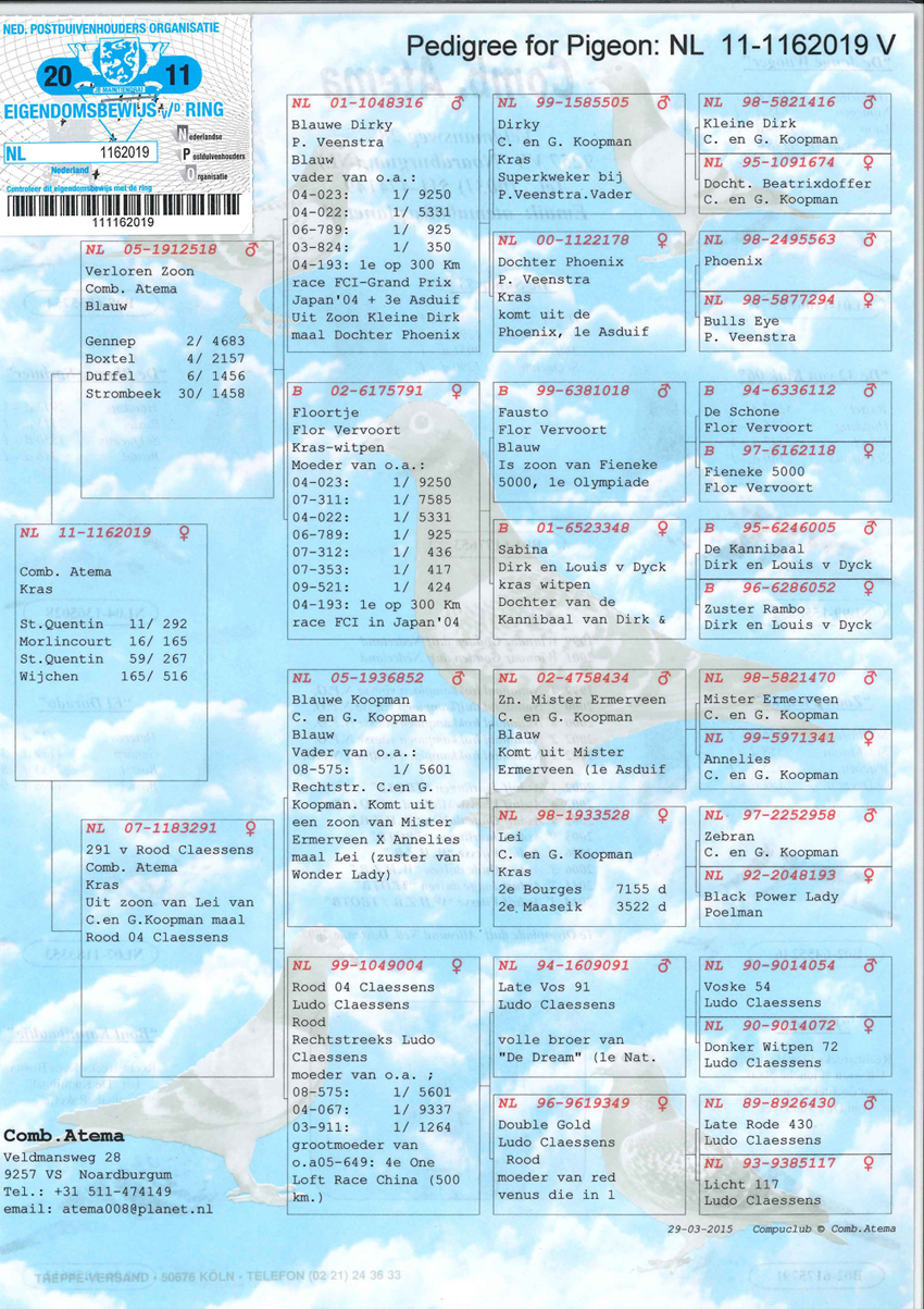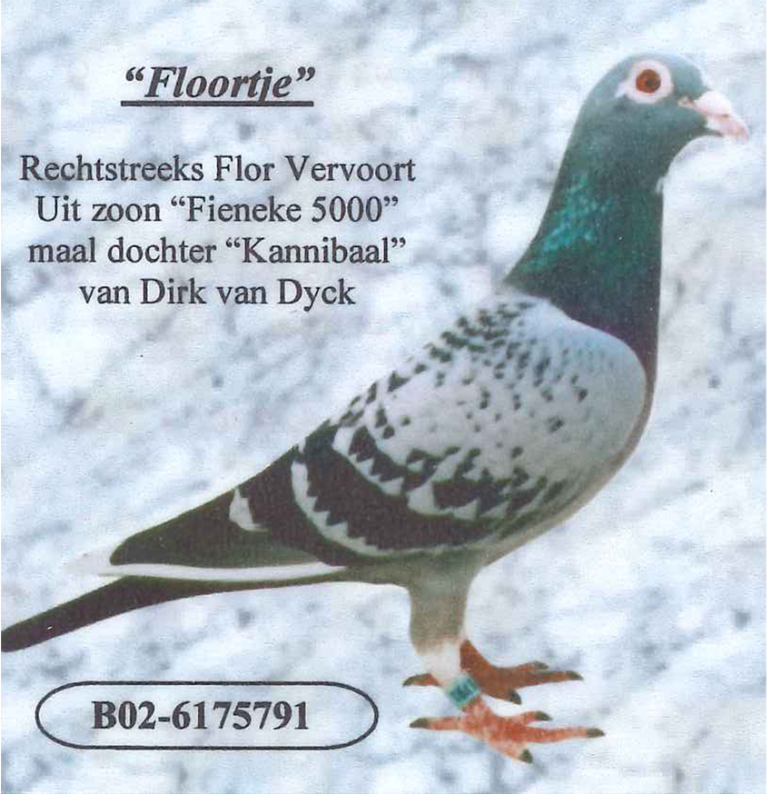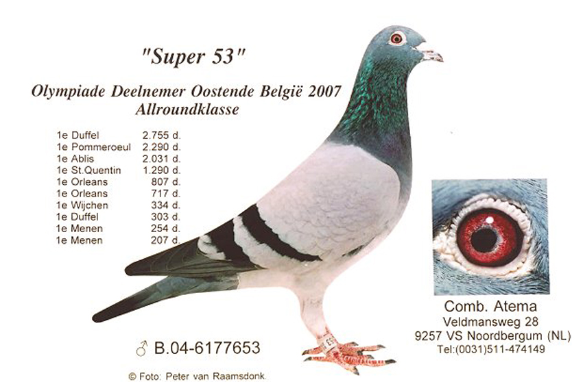 NL09-1649642 “DOCHTER SUPER 53” (geschelpt bont – duivin) VADER : B04-6177653 “DE SUPER 53” !! 1 e Olympiadeduif All-Round Nederland Oostende ’07. Een vliegend fenomeen rechtstreeks afkomstig van Fernand en Koen Mariën. Won 10x 1e met 1e Duffel 2755 d. ... 1e Pommeroeul 2290 d. ... 1 e Ablis 2031 d. ... 1 e St. Quentin 1290 d. ... 1e Orleans 807 d. ... 1e Orleans 717 d. etc. Is vader van 07-311 (1e Lessines 7585 d.) ... 07-312 (1e Hasselt 436 d.) ... 07-353 (3e asduif oud rayon Het Noorden) ... 09-521 (1e Hasselt 424 d.) en grootvader van o.a. 1e Blois 642 d. ... 1e Heteren 528 d. ... 1e Gennep 359 d. ... 1e Achene 293 d. ... 1e Boxtel 928 d. ... 1e Boxtel 336 d. ... en 1e Prov. Asduif Dagfond Afd. 11 2009 bij Tj&A Bosma. G.V. : B99-6396264 “Florian”. Won 7 x 1e en komt van Vercammen, Herenthout uit 303-96 René Lemmens x 220-98. G.M. : DV 0987-02-590 “Ysabele”. Via Toni v. Ravenstein uit 444-93 “Jonge Kolonel” Gaby Vandenabeele x 214-00 Flor Engels en Zn. MOEDER : B02-6175791 “FLOORTJE”. Superkweekmoedertje rechtstreeks afkomstig van wijlen Flor Vervoort. Is moeder van o.a. 04-023 (1e Wijchen 9250 d.) ... 04-022 (1e St. Ghislain 5331 d.) ... 06-789 (1e van 925 d.) ... 04-193 (1e prijs 300 km.-vlucht F.C.I. Grand Prix Race Japan 2004 en tevens 3e Asduif over alle vluchten) en voorts met “Super 53” van 07-311 ... 07-312 ... 07-353 en 09-521. Is daarnaast grootmoeder van 07-155 (1e Pommeroeul 2519 d.) ... 08-543 (1e Achene 293 d.) en 08-459 (1e Heteren 528 d.). G.V. : B99-6381018 “Fausto”. Rechtstreeks uit “De Schone” 112-94 x wonderduif “Fieneke 5000” 118-97. G.M. : B01-6523348 “Sabina”. Rechtstreeks Dirk Van Dyck uit “De Kannibaal” 005-95 x “Zuster Rambo” 052-96.