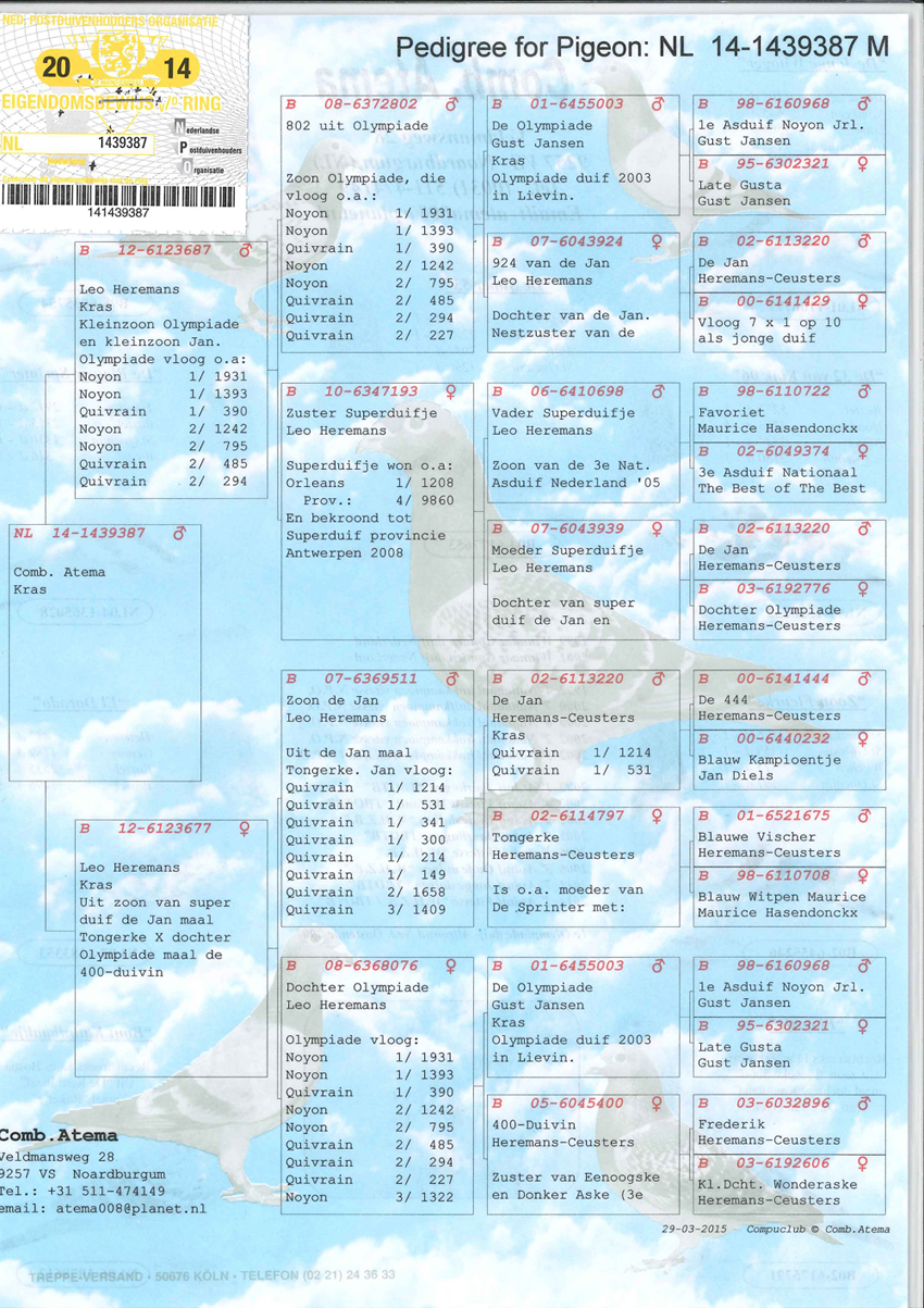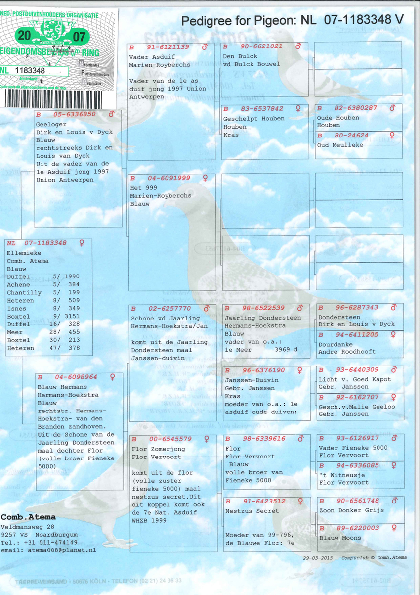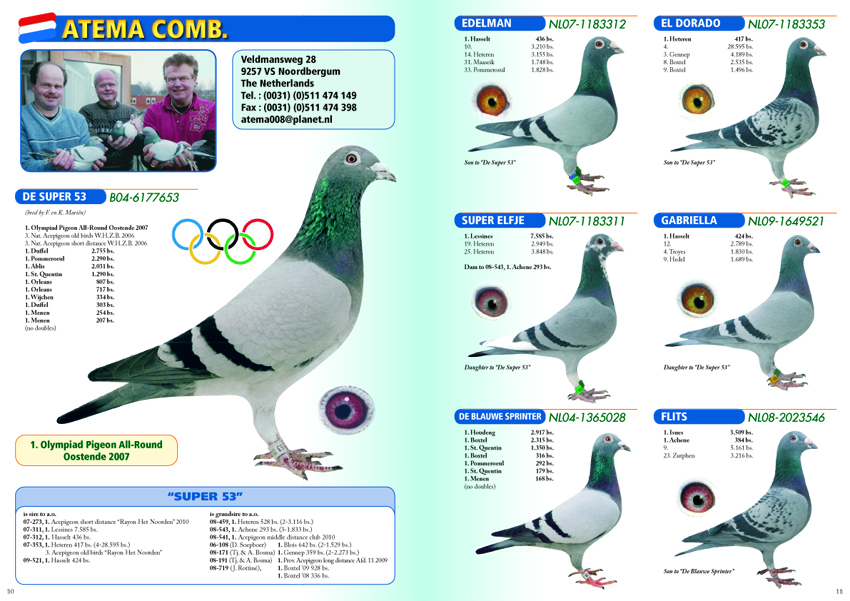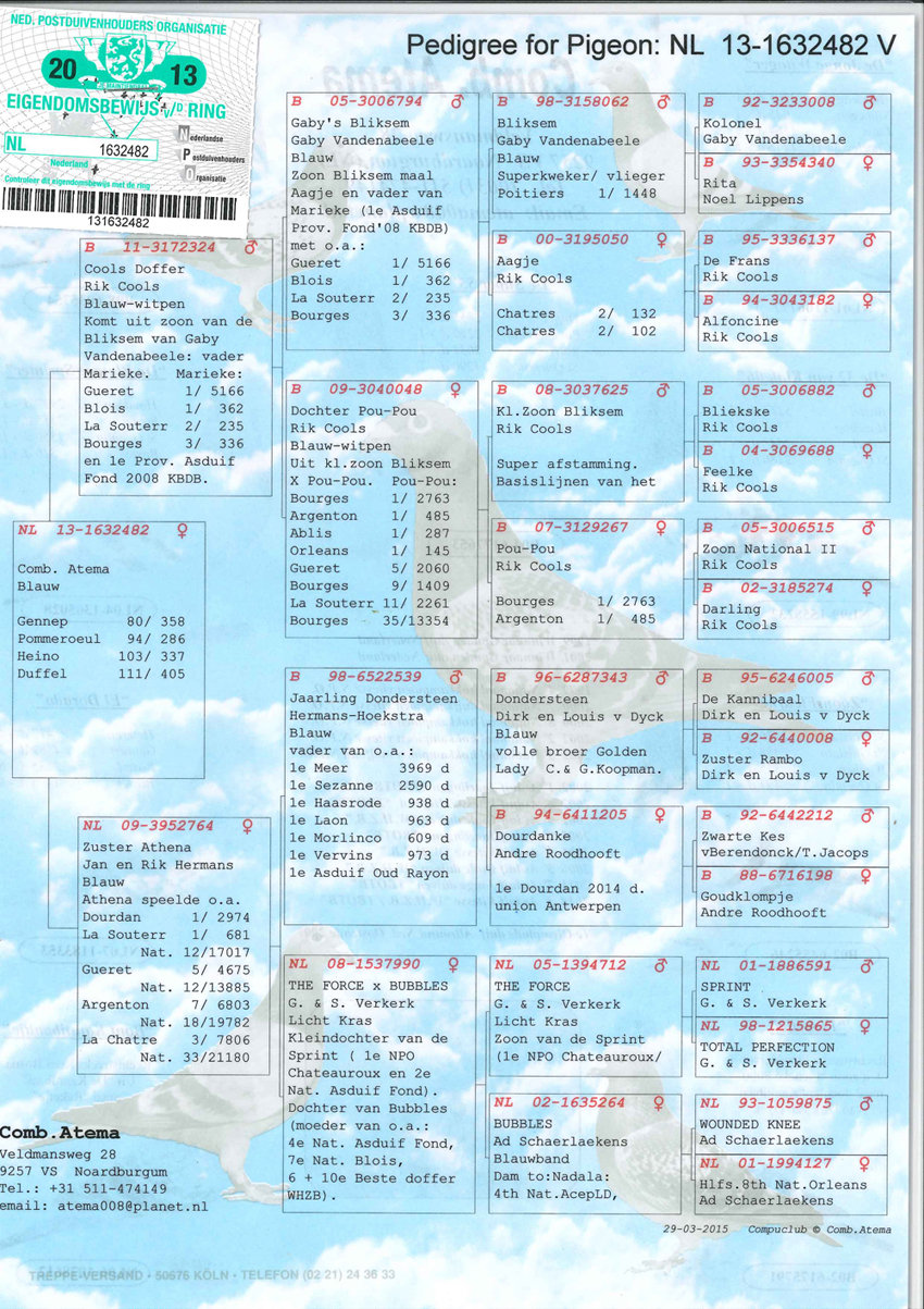 NL09-1649642 “DOCHTER SUPER 53” (geschelpt bont – duivin) VADER : B04-6177653 “DE SUPER 53” !! 1 e Olympiadeduif All-Round Nederland Oostende ’07. Een vliegend fenomeen rechtstreeks afkomstig van Fernand en Koen Mariën. Won 10x 1e met 1e Duffel 2755 d. ... 1e Pommeroeul 2290 d. ... 1 e Ablis 2031 d. ... 1 e St. Quentin 1290 d. ... 1e Orleans 807 d. ... 1e Orleans 717 d. etc. Is vader van 07-311 (1e Lessines 7585 d.) ... 07-312 (1e Hasselt 436 d.) ... 07-353 (3e asduif oud rayon Het Noorden) ... 09-521 (1e Hasselt 424 d.) en grootvader van o.a. 1e Blois 642 d. ... 1e Heteren 528 d. ... 1e Gennep 359 d. ... 1e Achene 293 d. ... 1e Boxtel 928 d. ... 1e Boxtel 336 d. ... en 1e Prov. Asduif Dagfond Afd. 11 2009 bij Tj&A Bosma. G.V. : B99-6396264 “Florian”. Won 7 x 1e en komt van Vercammen, Herenthout uit 303-96 René Lemmens x 220-98. G.M. : DV 0987-02-590 “Ysabele”. Via Toni v. Ravenstein uit 444-93 “Jonge Kolonel” Gaby Vandenabeele x 214-00 Flor Engels en Zn. MOEDER : B02-6175791 “FLOORTJE”. Superkweekmoedertje rechtstreeks afkomstig van wijlen Flor Vervoort. Is moeder van o.a. 04-023 (1e Wijchen 9250 d.) ... 04-022 (1e St. Ghislain 5331 d.) ... 06-789 (1e van 925 d.) ... 04-193 (1e prijs 300 km.-vlucht F.C.I. Grand Prix Race Japan 2004 en tevens 3e Asduif over alle vluchten) en voorts met “Super 53” van 07-311 ... 07-312 ... 07-353 en 09-521. Is daarnaast grootmoeder van 07-155 (1e Pommeroeul 2519 d.) ... 08-543 (1e Achene 293 d.) en 08-459 (1e Heteren 528 d.). G.V. : B99-6381018 “Fausto”. Rechtstreeks uit “De Schone” 112-94 x wonderduif “Fieneke 5000” 118-97. G.M. : B01-6523348 “Sabina”. Rechtstreeks Dirk Van Dyck uit “De Kannibaal” 005-95 x “Zuster Rambo” 052-96.
