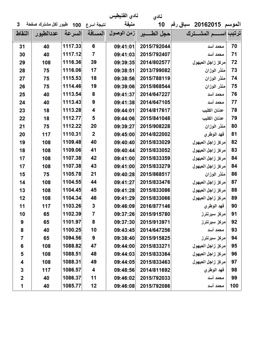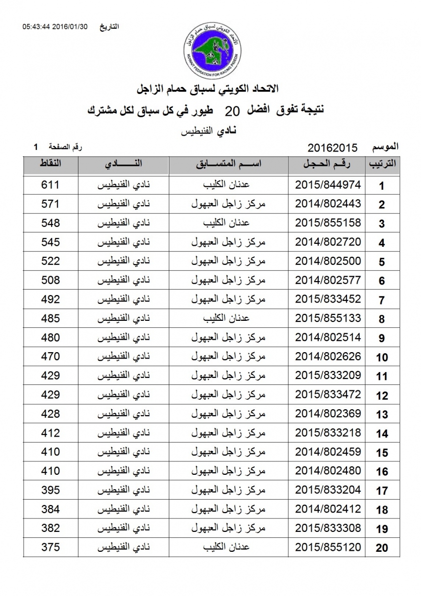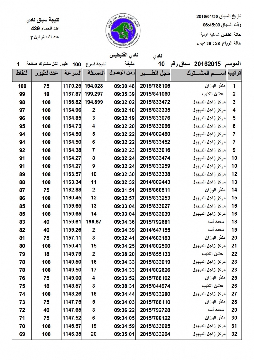 > منتديات الاتحاد الكويتي لسباق حمام الزاجل > منتدي اخبار السباقات > نتائج سباقات الاتحاد الكويتي / Race results > نتيجة السباق العاشرلنادي الفنيطيس - منيفة