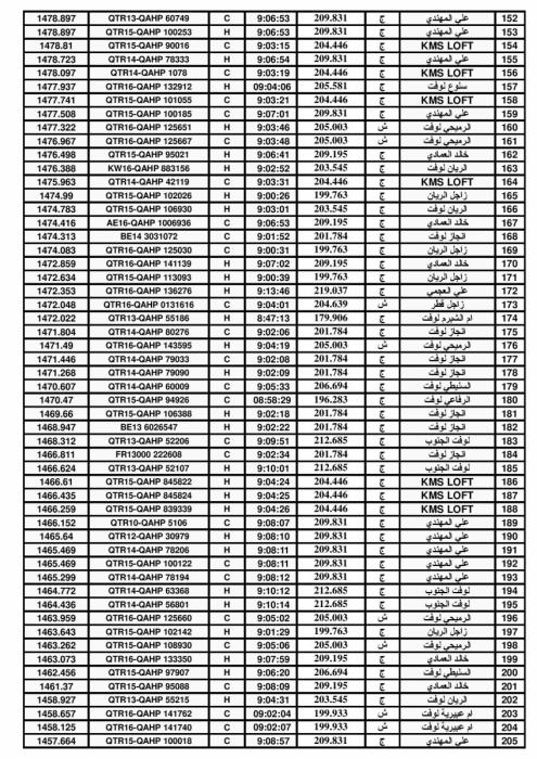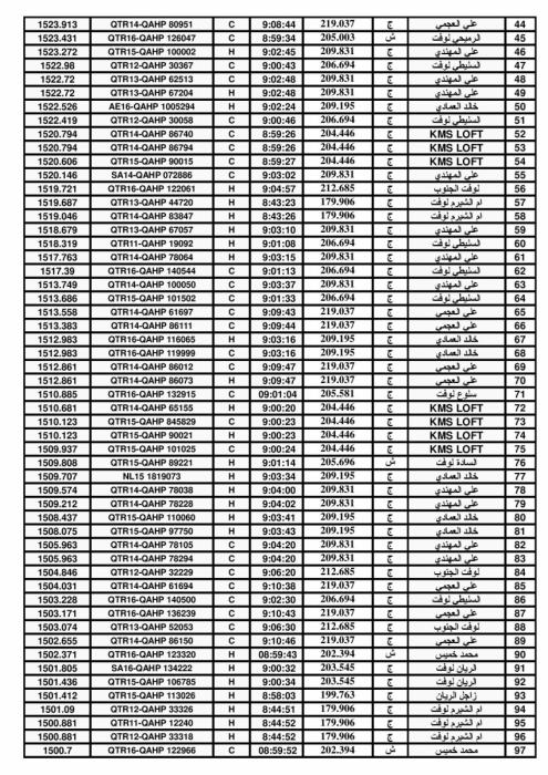 السلام عليكم ورحمة الله السادة متتبعي الاتحاد الكويتي لسباق حمام الزاجل . نظم المركز الشبابي للهوايات (الحمام الزاجل) رابع سباق لموسم 2016ـــ2017 سباق النايفية 2 (210كلم) . مر السباق في جو معتدل ورياح شمالي غربي، حيث تمكن الهاوي خالد العمادي من احراز المركز الاول على اللجنة الجنوبية وعلى العامة . والهاوي محمد خميس احرز المركز الآول على اللجنة الشمالية. مبروك للفائزين. اللجنة الجنوبية ![]() ![]() ![]() اللجنة الشمالية ![]() ![]() ![]() النتيجة العامة ![]() ![]() ![]() ![]() ![]() ![]() |