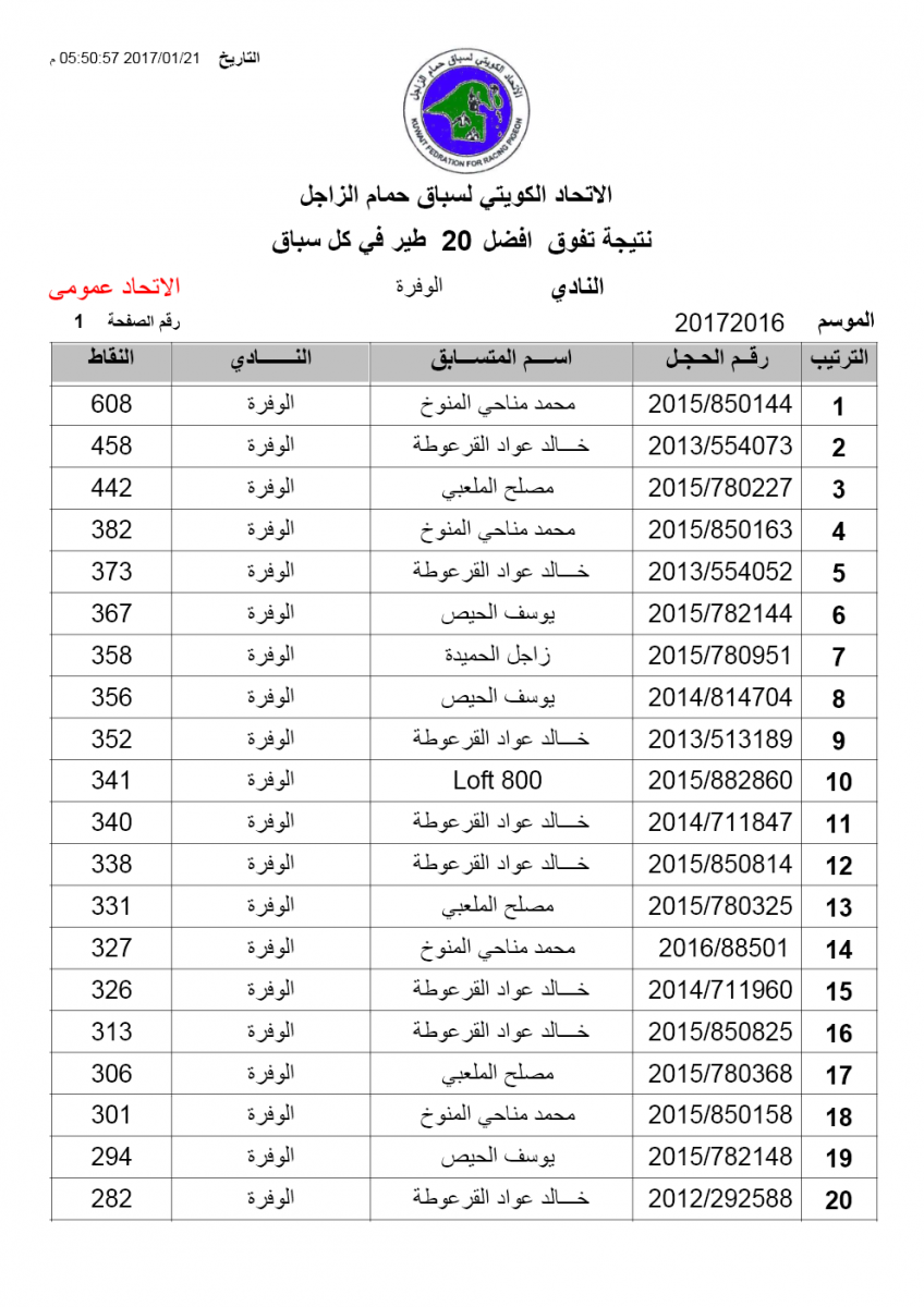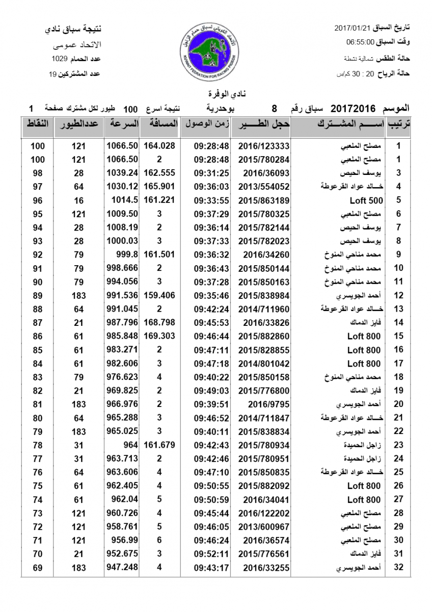> منتديات الاتحاد الكويتي لسباق حمام الزاجل > منتدي اخبار السباقات > نتائج سباقات الاتحاد الكويتي / Race results > نتيجة السباق الثامن بوحدرية لنادى الوفرة