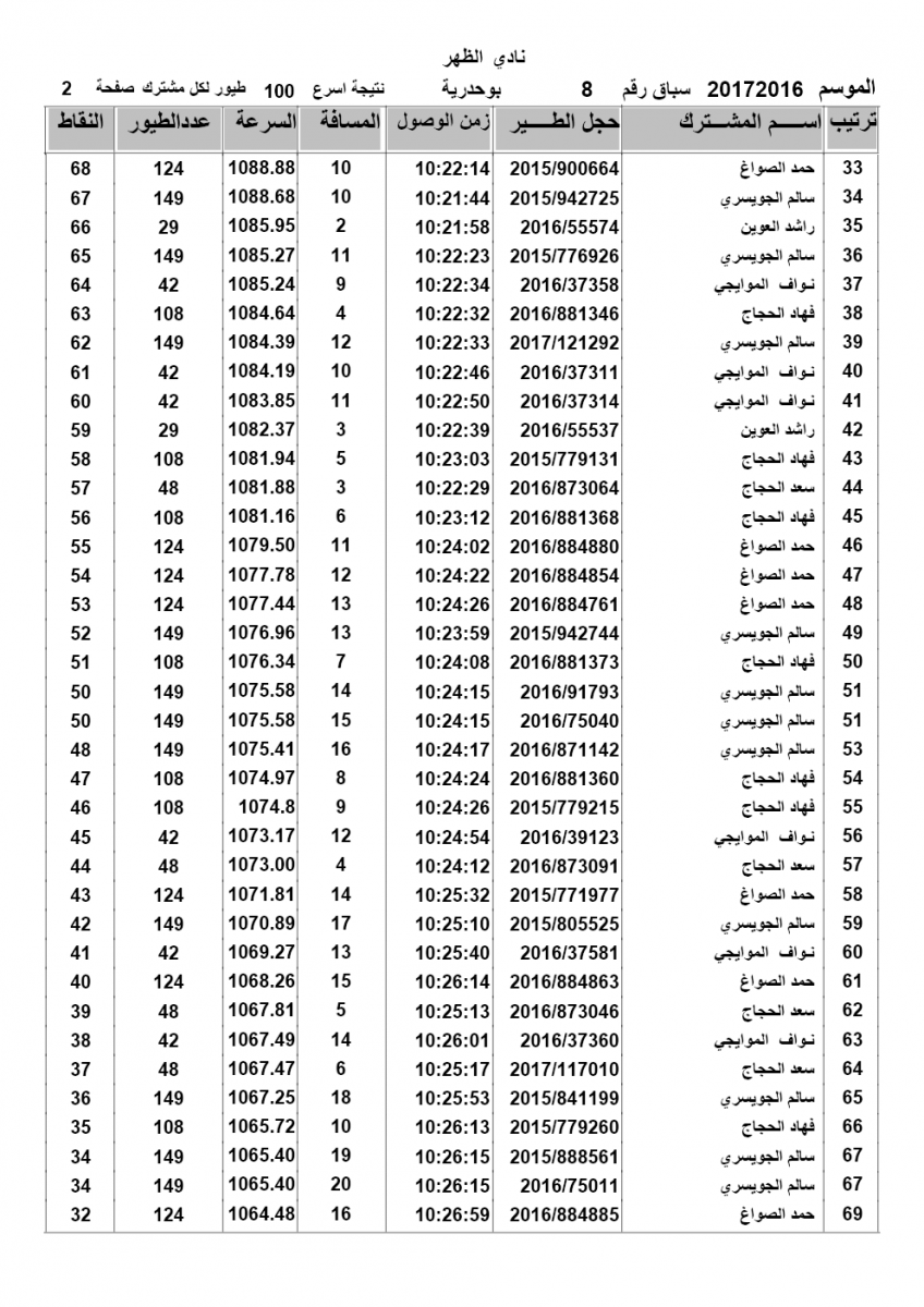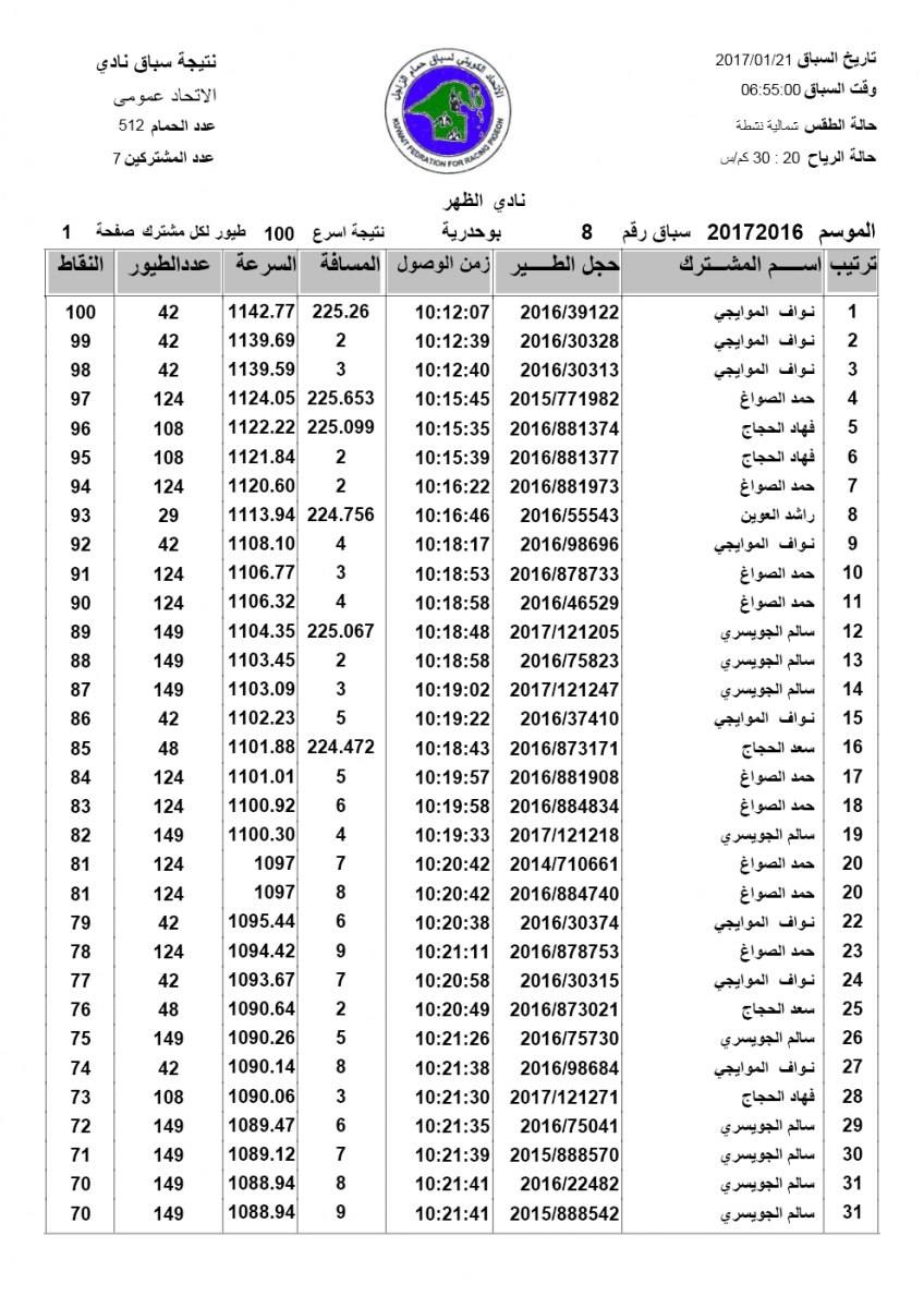 > منتديات الاتحاد الكويتي لسباق حمام الزاجل > منتدي اخبار السباقات > نتائج سباقات الاتحاد الكويتي / Race results > نتيجة السباق الثامن بوحدرية لنادى الظهر