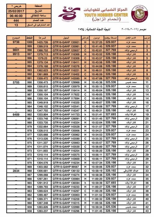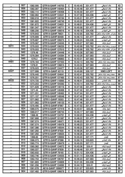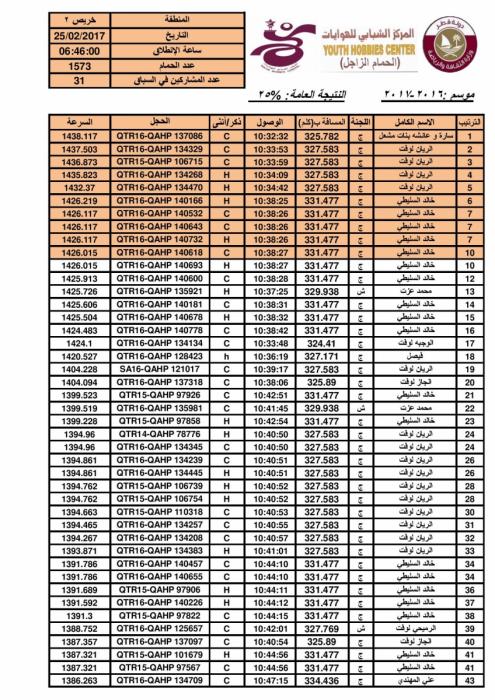 السلام عليكم ورحمة الله السادة متتبعي الاتحاد الكويتي لسباق الحمام الزاجل . نظم المركز الشبابي للهوايات (الحمام الزاجل) السباق الحادي عشر لموسم 2016ـــ2017 سباق (330كلم) . مر السباق في جو معتدل ورياح شمالي غربي، حيث تمكن لوفت بنات الشيخ مشعل احراز المركز الآول على اللجنة الجنوبية وعلى العامة. و الهاوي محمد عزت من احراز المركز الاول على اللجنة الشمالية مبروك للفائزين. النتيجة العامة ![]() ![]() ![]() ![]() ![]() ![]() ![]() ![]() اللجنة الجنوبية ![]() ![]() ![]() ![]() ![]() ![]() اللجنة الشمالية ![]() ![]() ![]() |