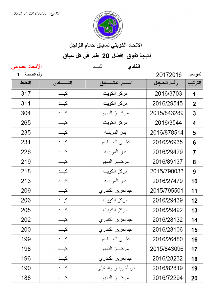 > منتديات الاتحاد الكويتي لسباق حمام الزاجل > منتدي اخبار السباقات > نتائج سباقات الاتحاد الكويتي / Race results > نتيجة سباق النويصيب الخامس لنادى كبد