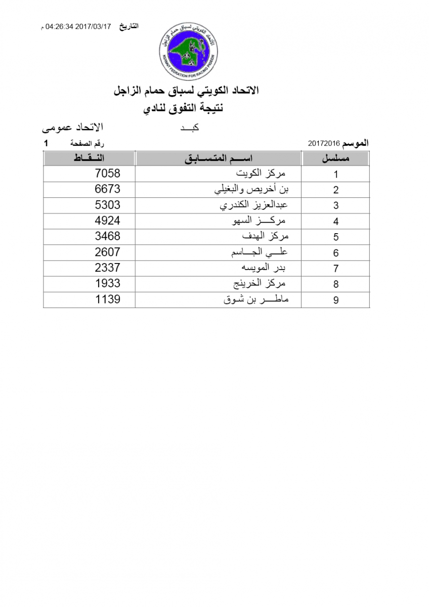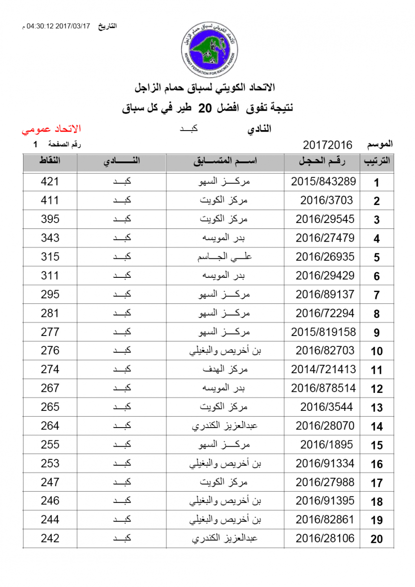 > منتديات الاتحاد الكويتي لسباق حمام الزاجل > منتدي اخبار السباقات > نتائج سباقات الاتحاد الكويتي / Race results > نتيجة السباق السابع النوييصيب لنادى كبد