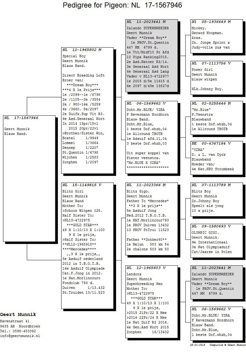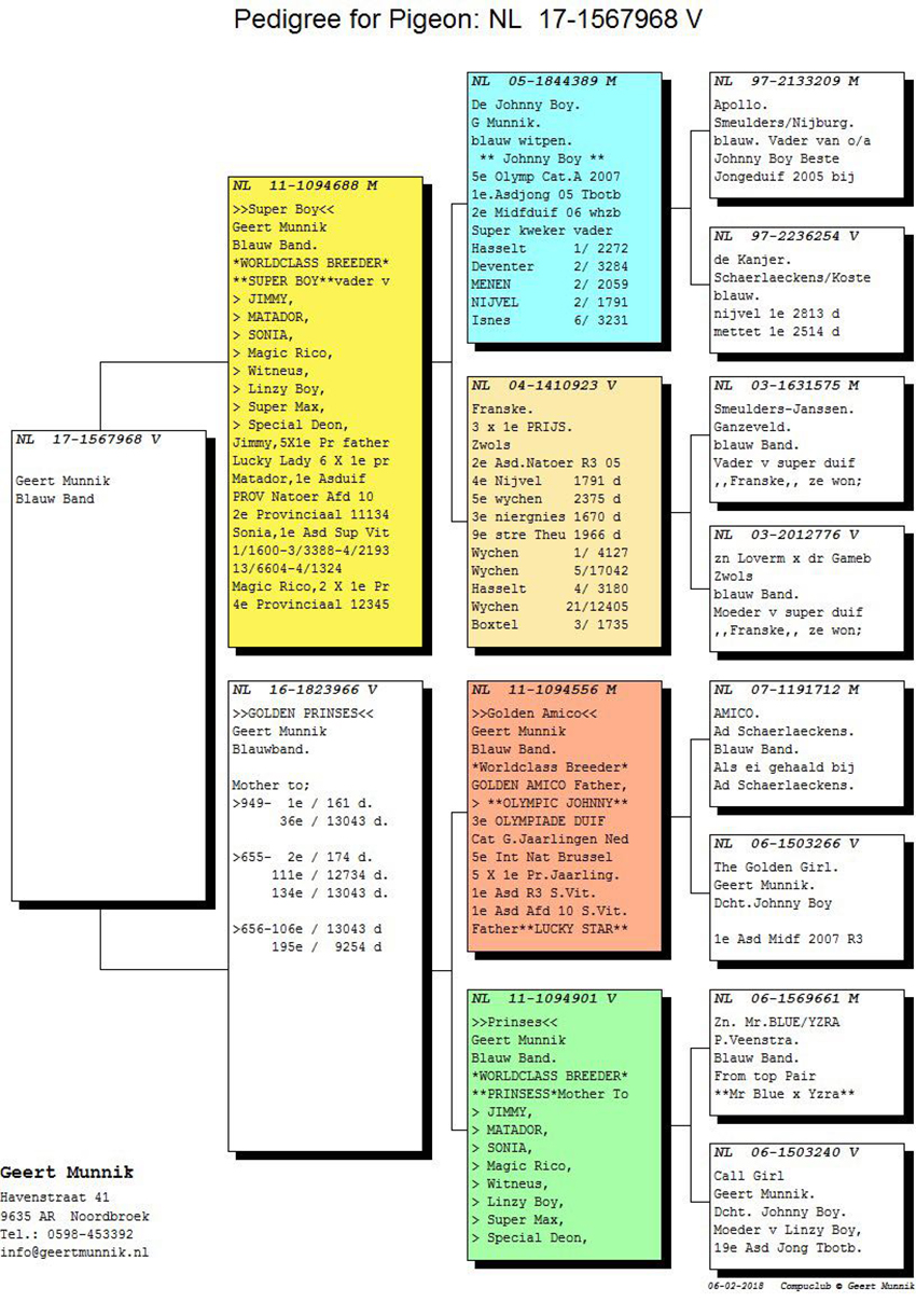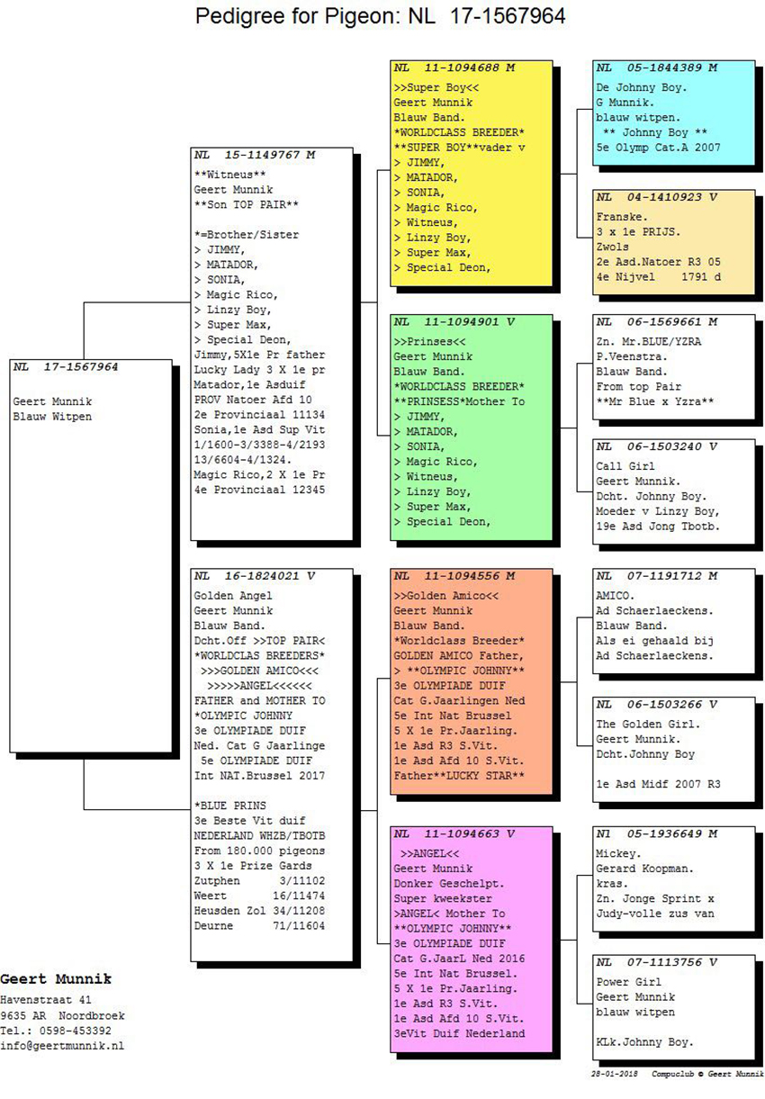 الأم جولدن أنجل أبنة مباشرة للزوج الرجب وهي خليصة بطل الاولمبياد أولمبياد جوني 3 أفضل طير على مستوى هولندا سباقات الفروخ والمركز الخامس اولمبياد بروكسل عام 2017