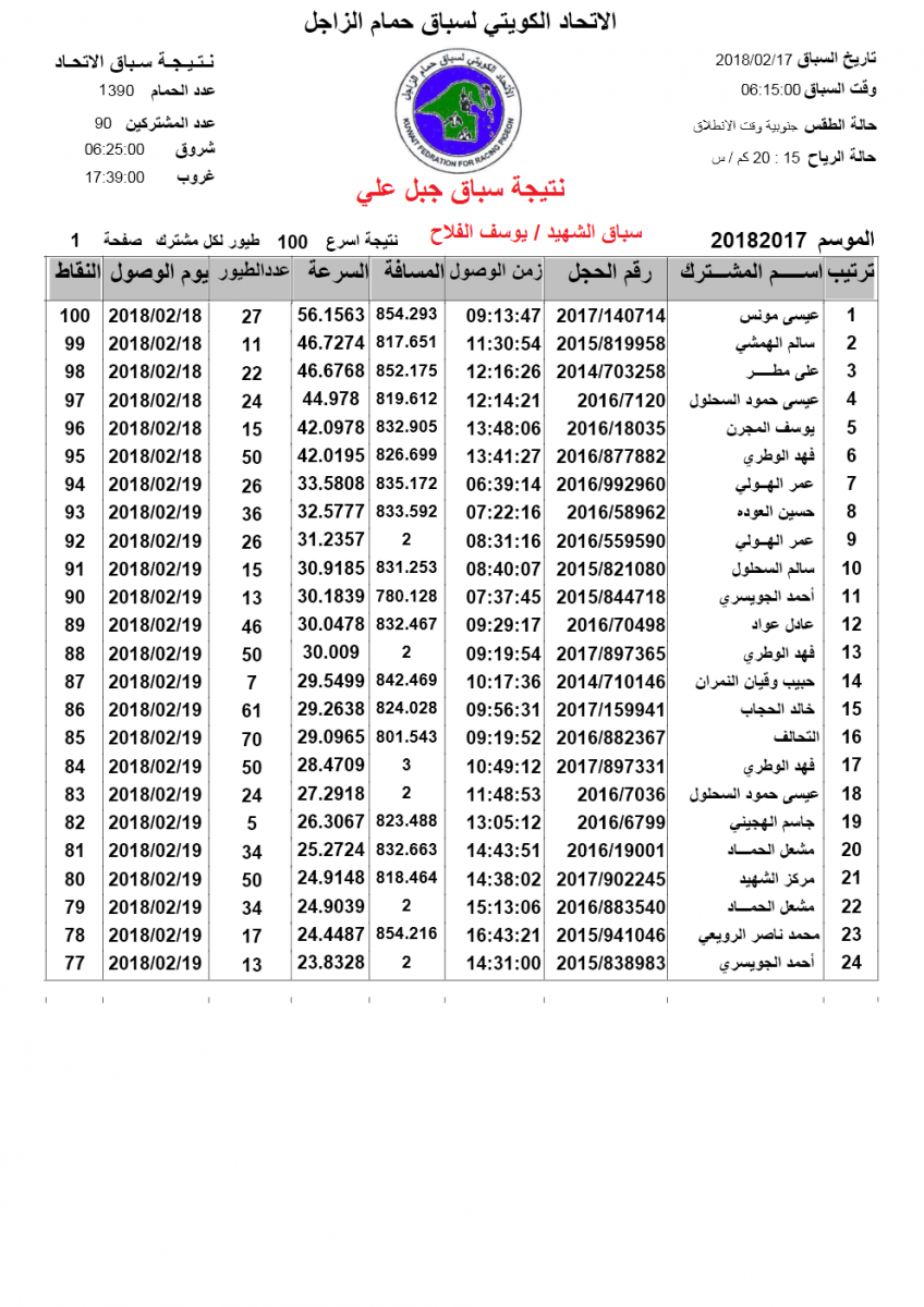 > منتديات الاتحاد الكويتي لسباق حمام الزاجل > منتدي اخبار السباقات > نتائج سباقات الاتحاد الكويتي / Race results > نتيجة سباق جبل علي مسافة 850 ك