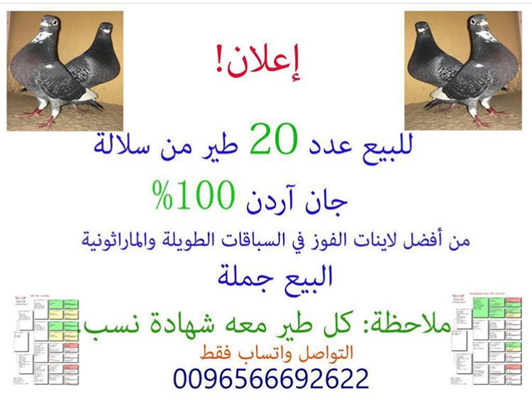 > منتديات الاتحاد الكويتي لسباق حمام الزاجل > منتدي الحمام > حمام للبيع / Pigeon For sale > للبيع جان آردن 100%