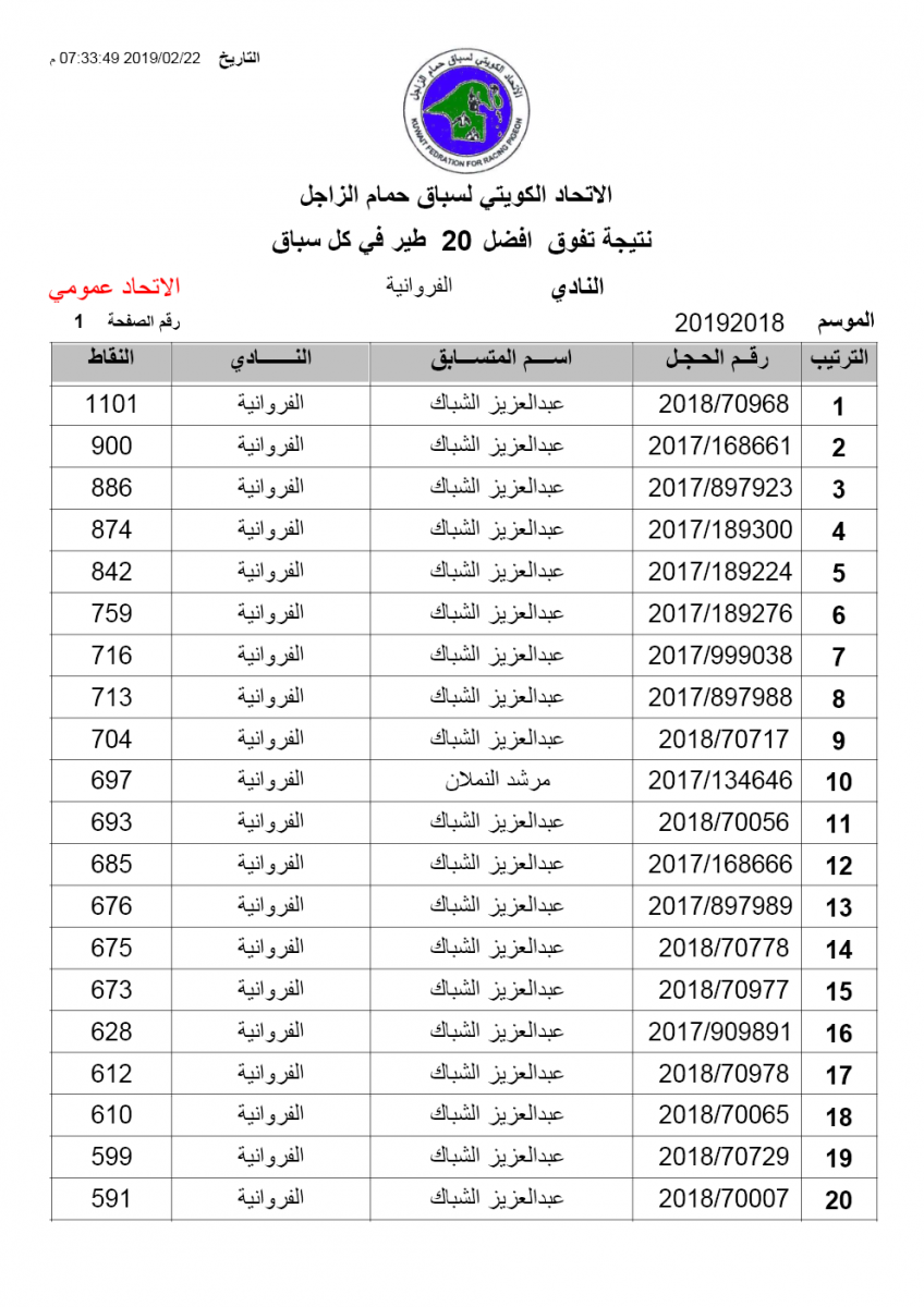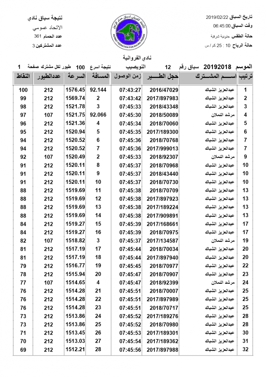 > منتديات الاتحاد الكويتي لسباق حمام الزاجل > منتدي اخبار السباقات > نتائج سباقات الاتحاد الكويتي / Race results > نتيجة السباق الثاني عشر النويصيب لنادي الفروانية