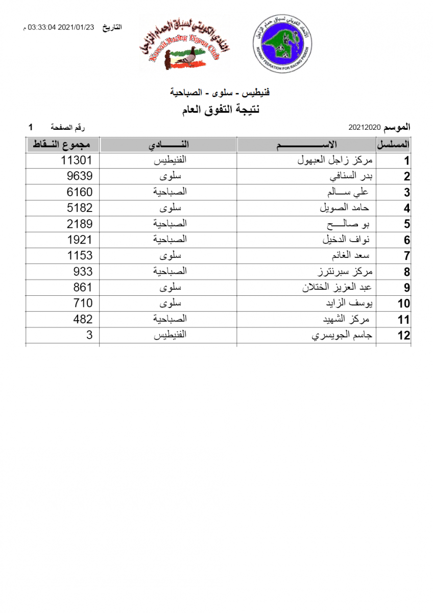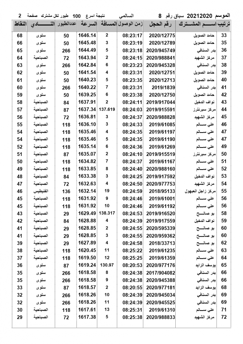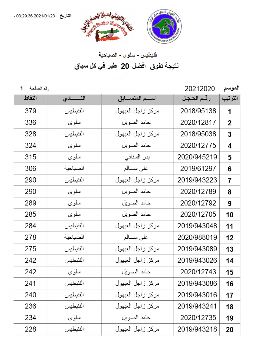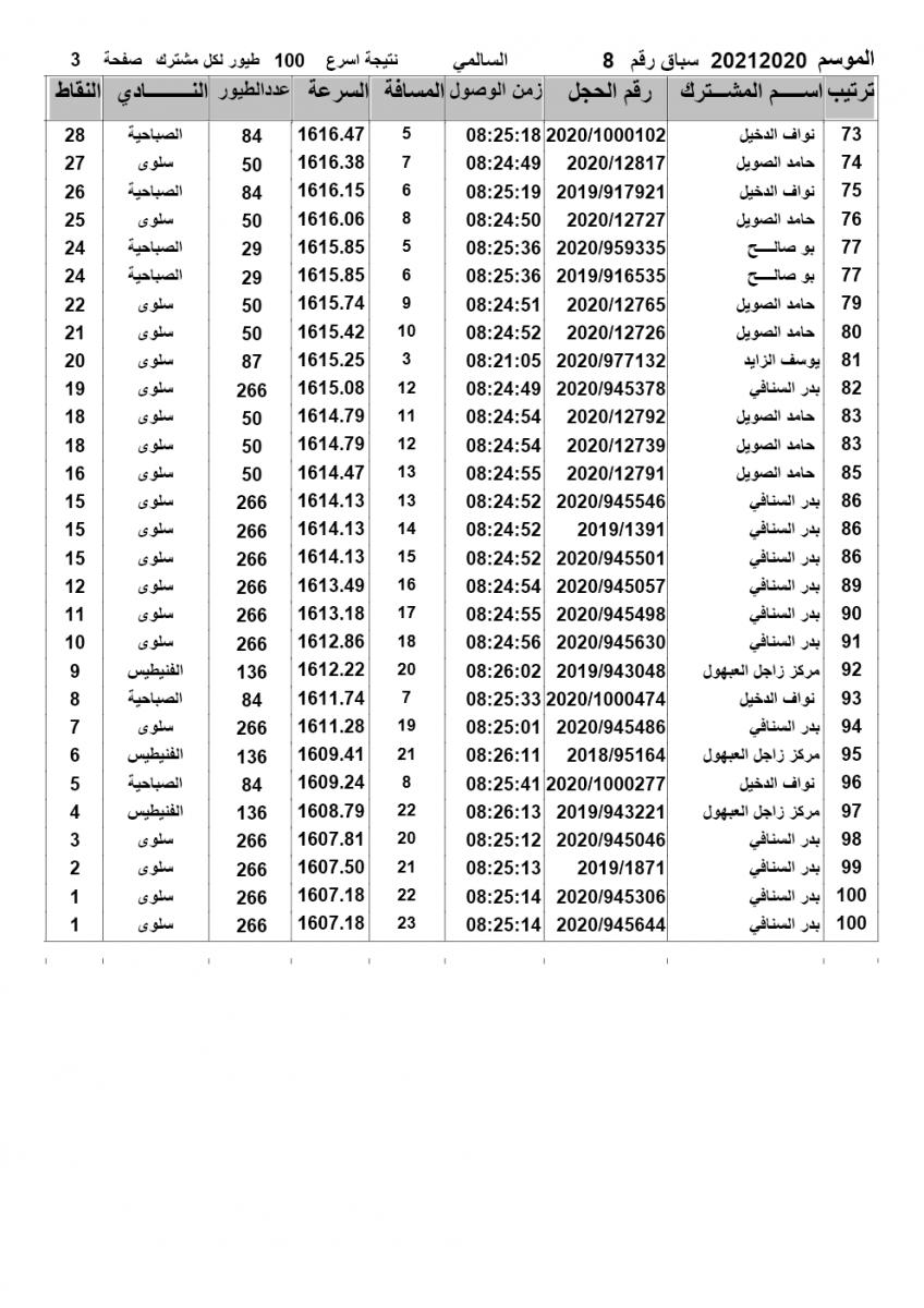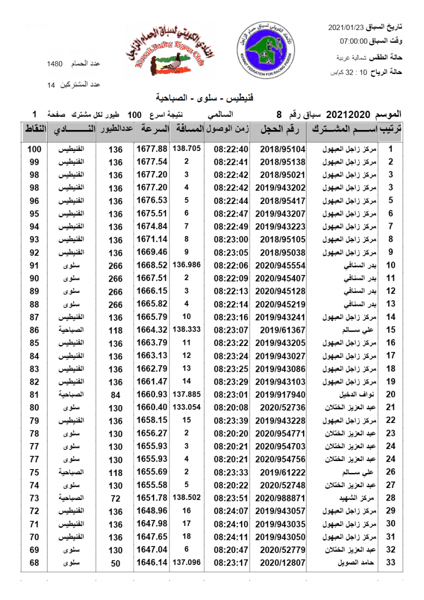 > منتديات الاتحاد الكويتي لسباق حمام الزاجل > منتدي اخبار السباقات > نتائج سباقات الاتحاد الكويتي / Race results > نتيجة السباق الثامن - السالمي - فنيطيس وسلوى والصباحية