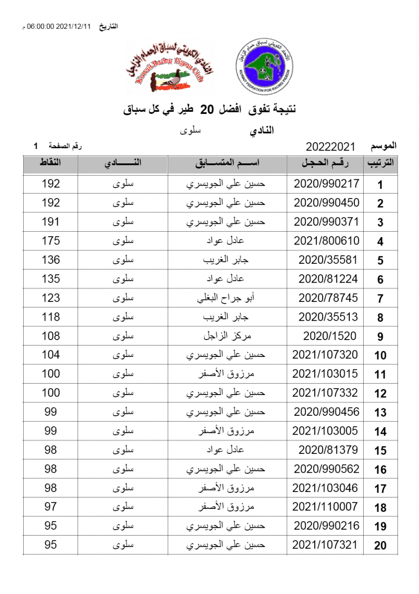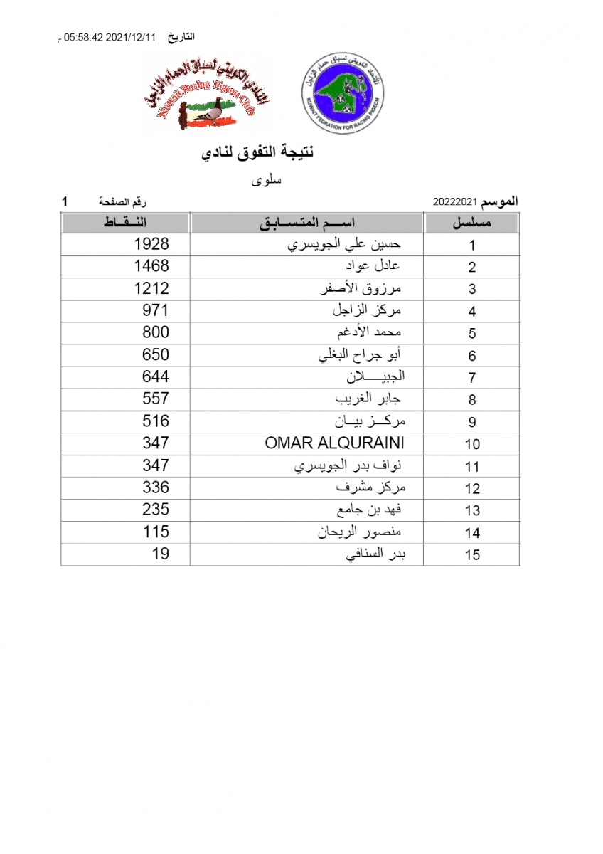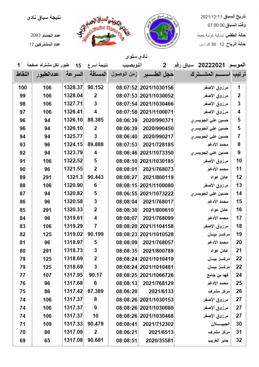 > منتديات الاتحاد الكويتي لسباق حمام الزاجل > منتدي اخبار السباقات > نتائج سباقات الاتحاد الكويتي / Race results > نتيجة السباق 2 - نويصيب - لنادي سلوى