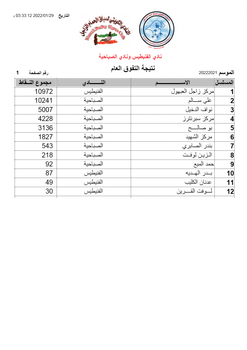 > منتديات الاتحاد الكويتي لسباق حمام الزاجل > منتدي اخبار السباقات > نتائج سباقات الاتحاد الكويتي / Race results > نتيجة السباق9 - السالمي - لنادي الفنيطيس والصباحية