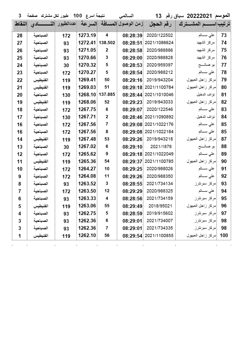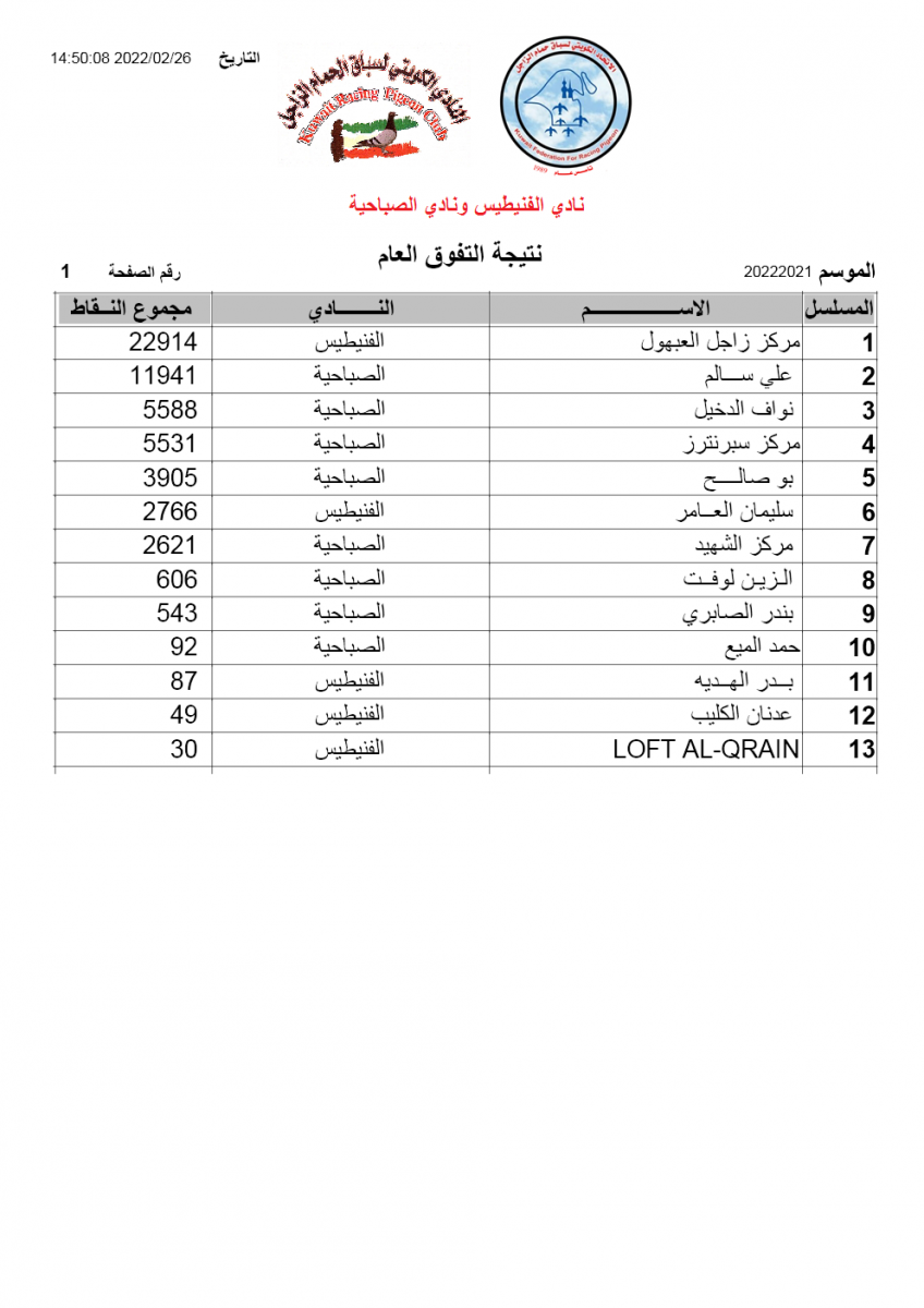 > منتديات الاتحاد الكويتي لسباق حمام الزاجل > منتدي اخبار السباقات > نتائج سباقات الاتحاد الكويتي / Race results > نتيجة السباق 13- السالمي- لنادي الفنيطيس والصباحية