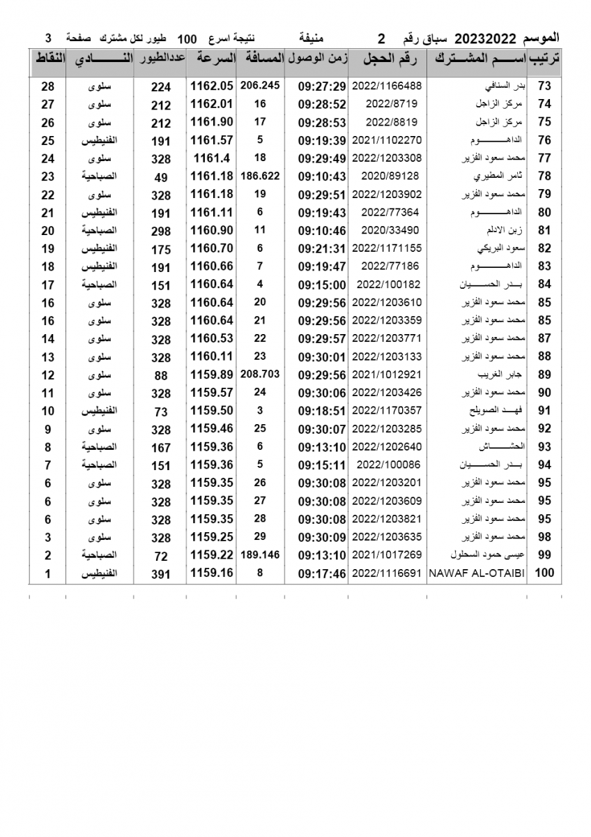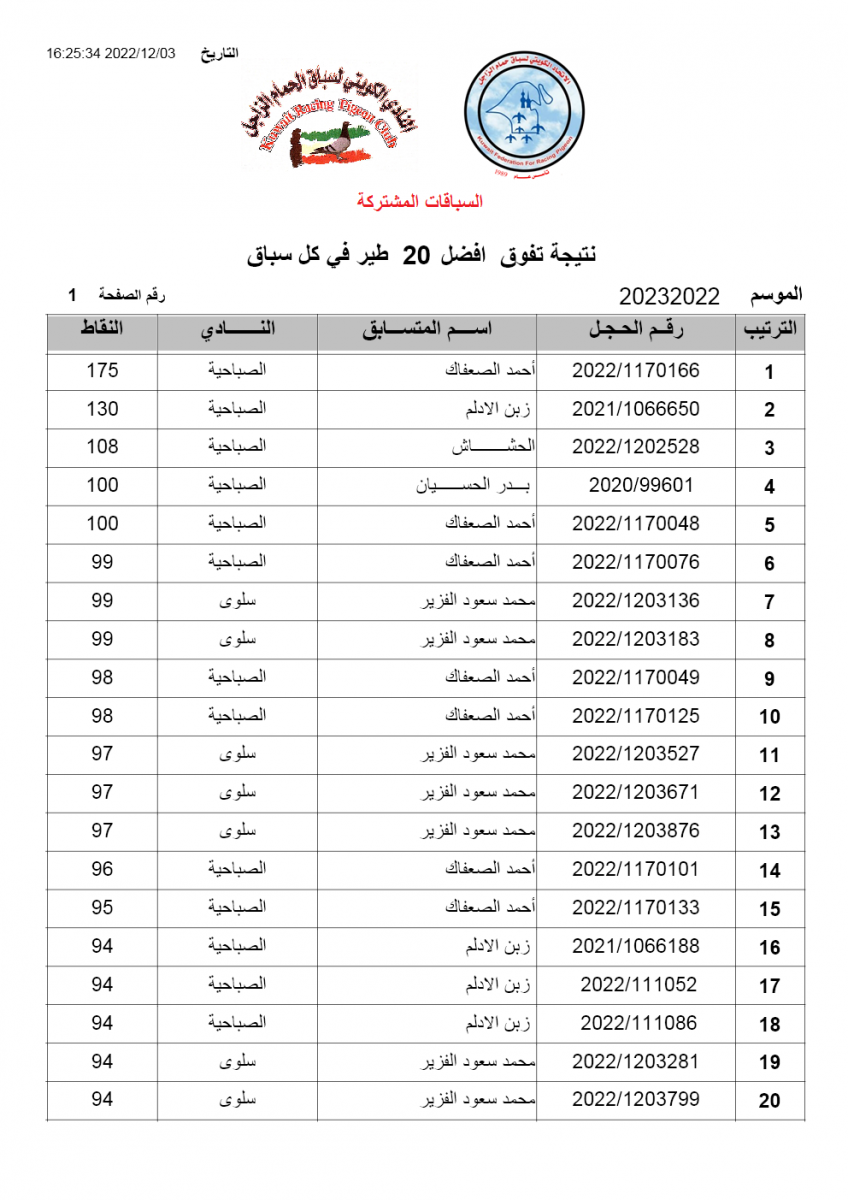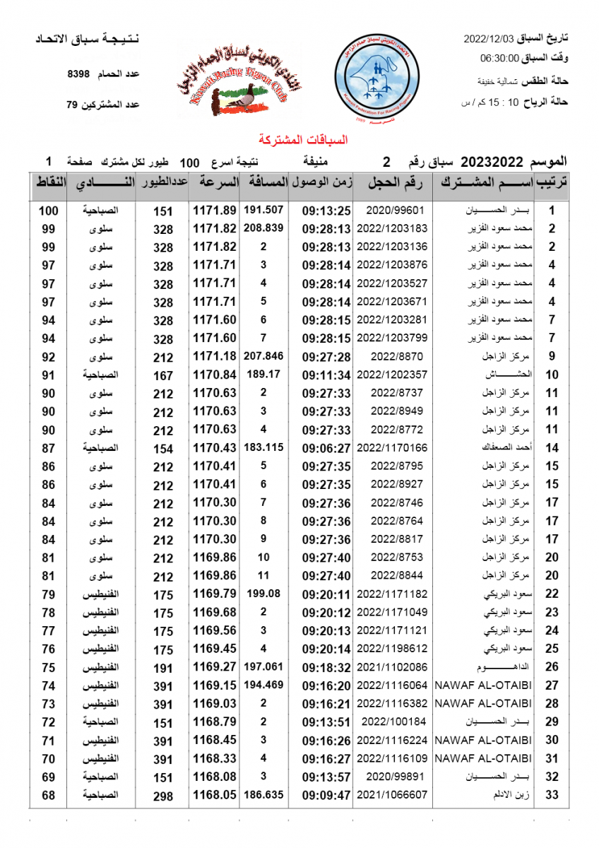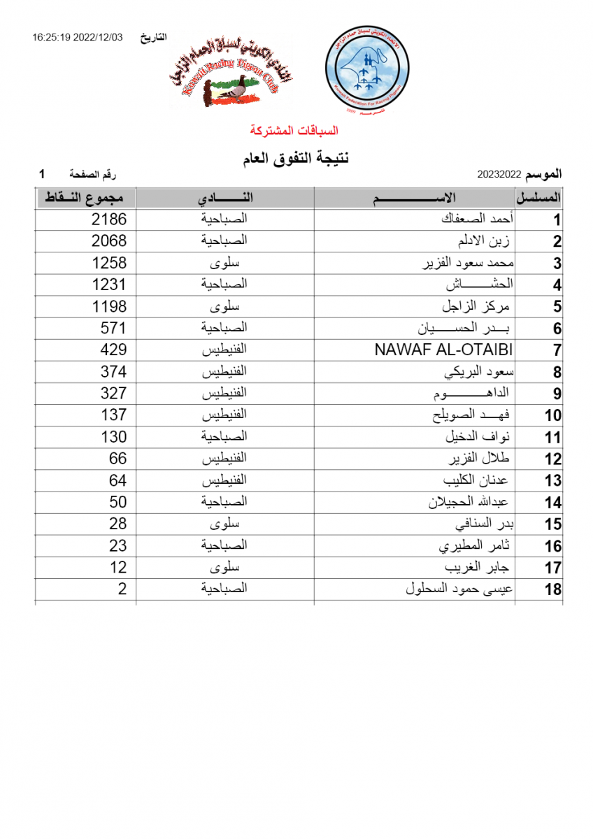 > منتديات الاتحاد الكويتي لسباق حمام الزاجل > منتدي اخبار السباقات > نتائج سباقات الاتحاد الكويتي / Race results > نتيجة السباق الثاني - منيفة - السباقات المشتركة