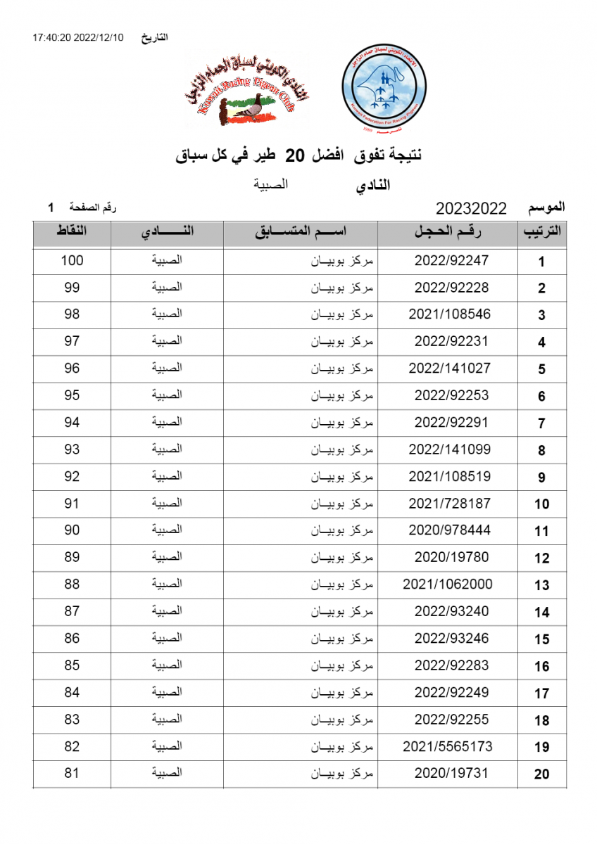 > منتديات الاتحاد الكويتي لسباق حمام الزاجل > منتدي اخبار السباقات > نتائج سباقات الاتحاد الكويتي / Race results > نتيجة السباق الثالث - بوحدرية - لنادي الصبية