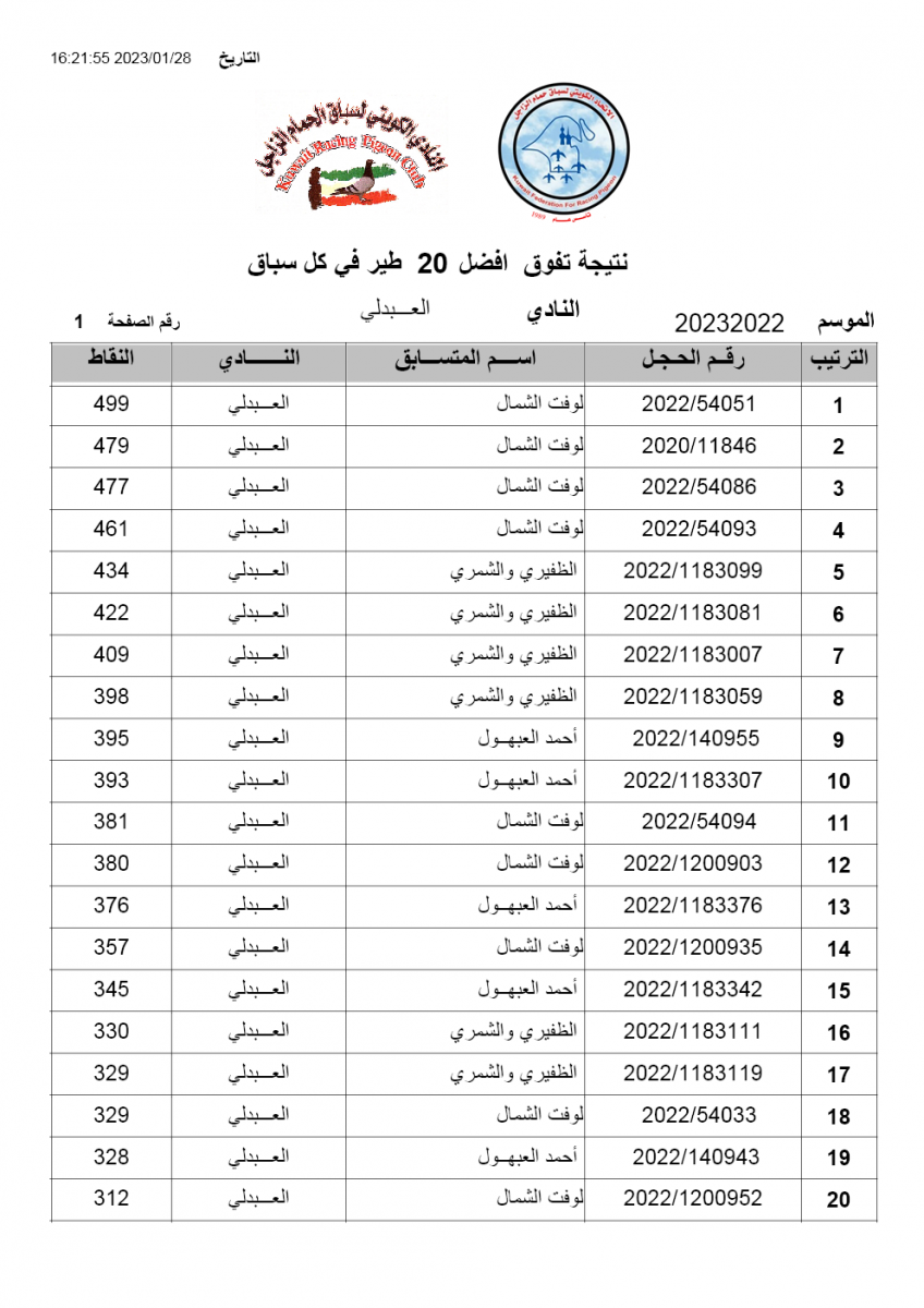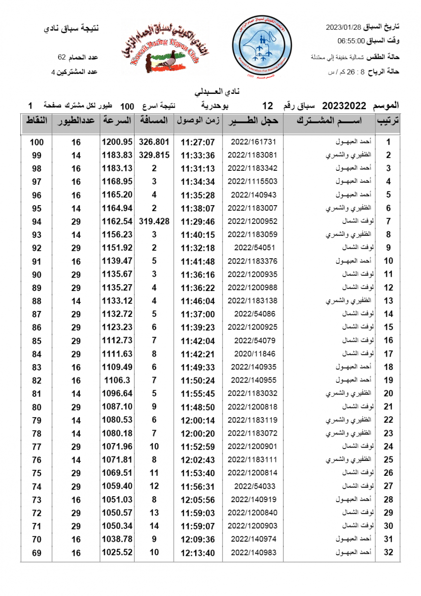> منتديات الاتحاد الكويتي لسباق حمام الزاجل > منتدي اخبار السباقات > نتائج سباقات الاتحاد الكويتي / Race results > نتيجة السباق الثاني عشر - بوحدرية 250 ك - لنادي العبدلي