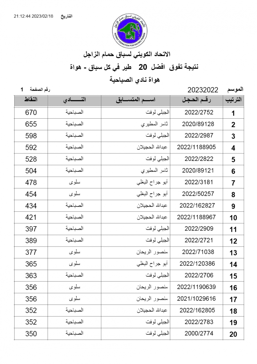 > منتديات الاتحاد الكويتي لسباق حمام الزاجل > منتدي اخبار السباقات > نتائج سباقات الاتحاد الكويتي / Race results > نتيجة السباق الخامس عشر - العقير 470 ك - لنادي الهواة الجدد