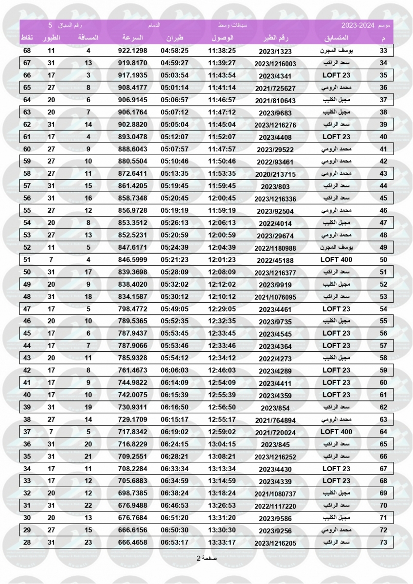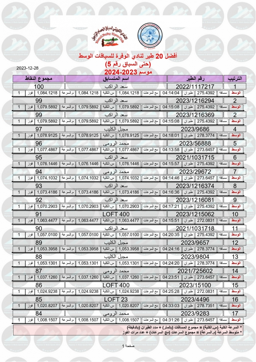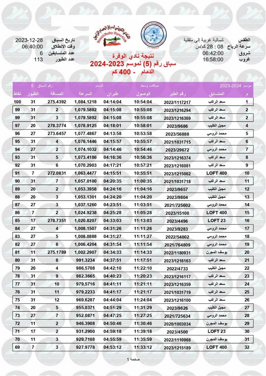 > منتديات الاتحاد الكويتي لسباق حمام الزاجل > منتدي اخبار السباقات > نتائج سباقات الاتحاد الكويتي / Race results > نتيجة السباق الخامس - الدمام 400 كم - لنادي الوفرة