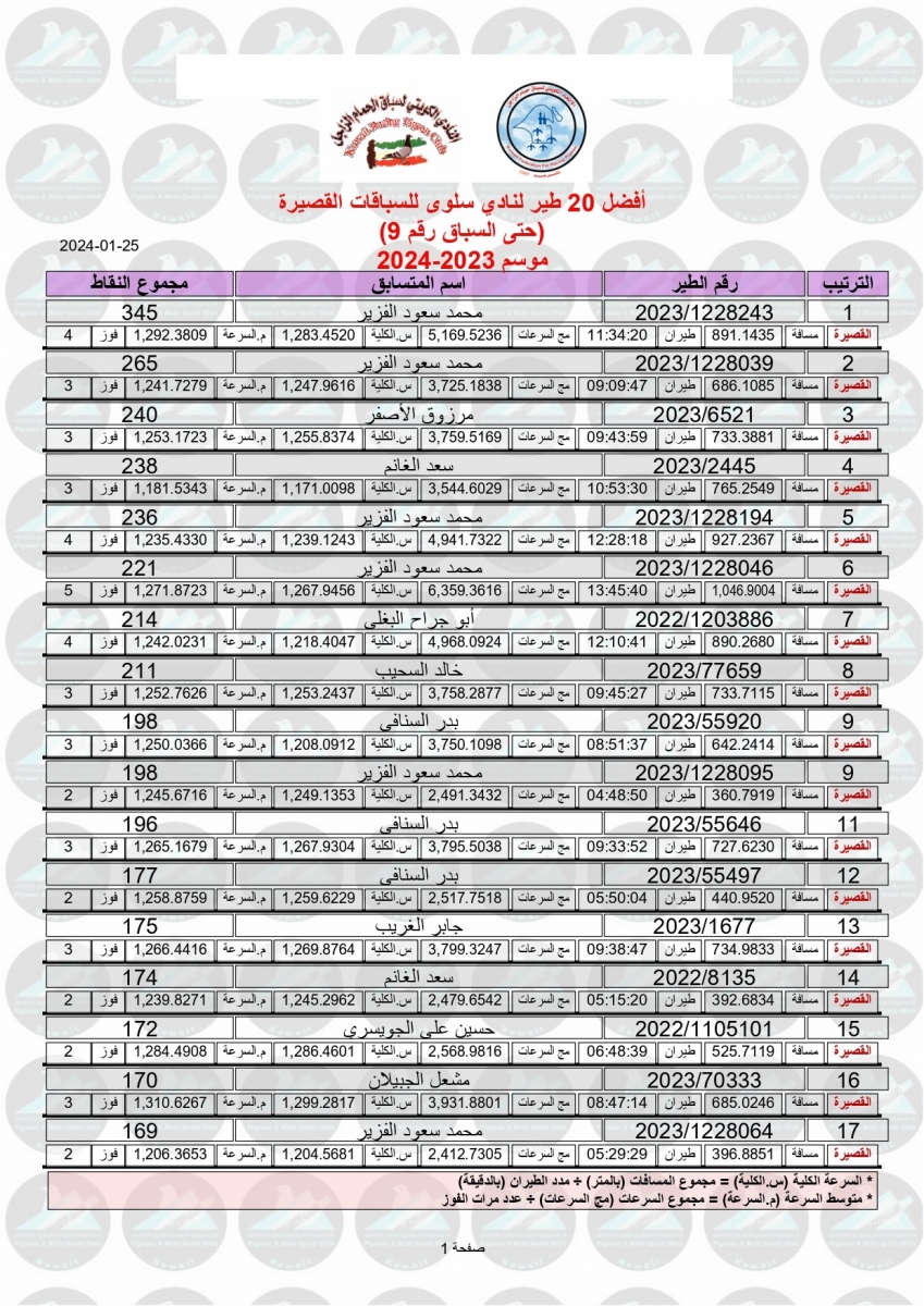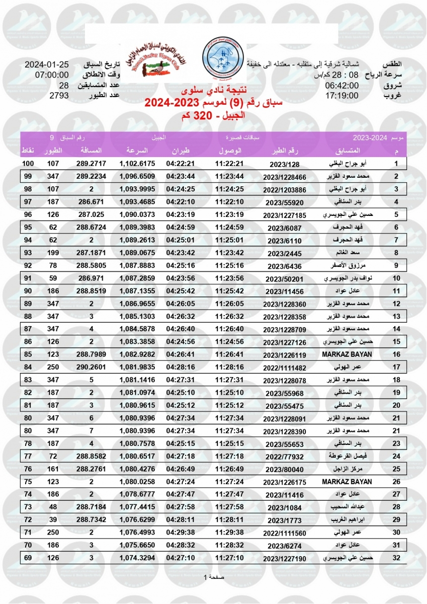 > منتديات الاتحاد الكويتي لسباق حمام الزاجل > منتدي اخبار السباقات > نتائج سباقات الاتحاد الكويتي / Race results > نتيجة السباق التاسع - الجبيل 320 ك - لنادي سلوى