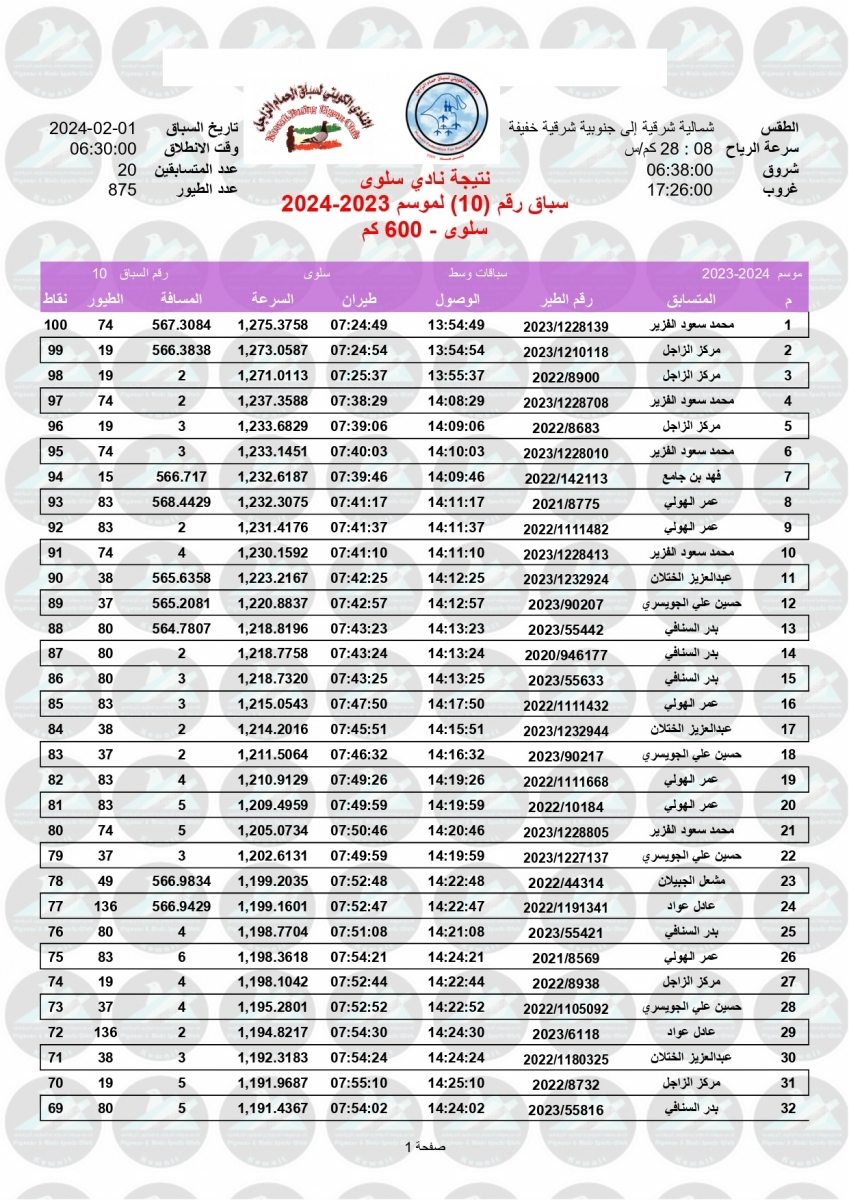 إليكم نتيجة السباق العاشر - سلوى 600 كم - لنادي سلوى