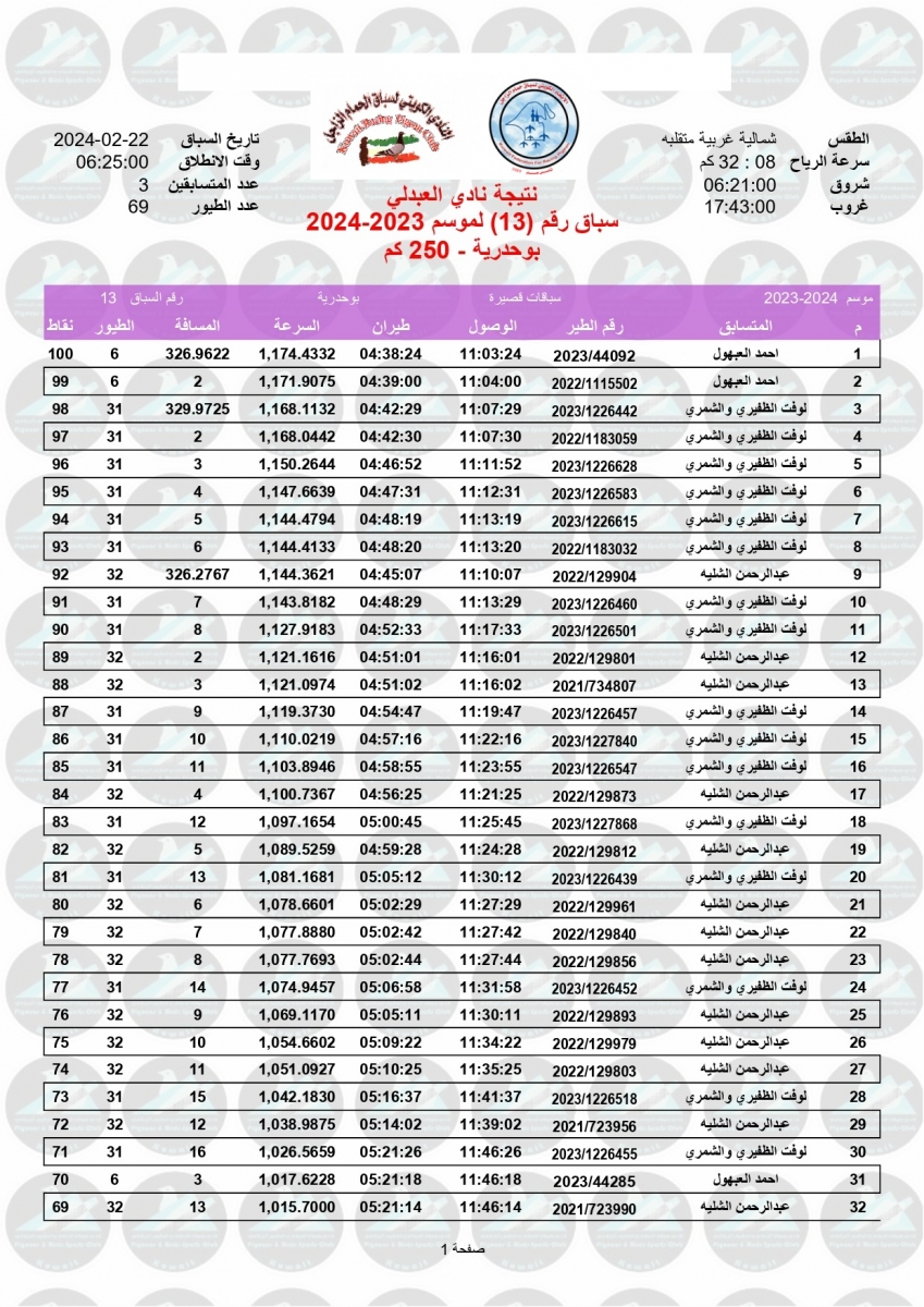نتيجة السباق 13 - بوحدرية 250 ك - لنادي العبدلي