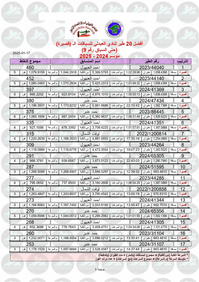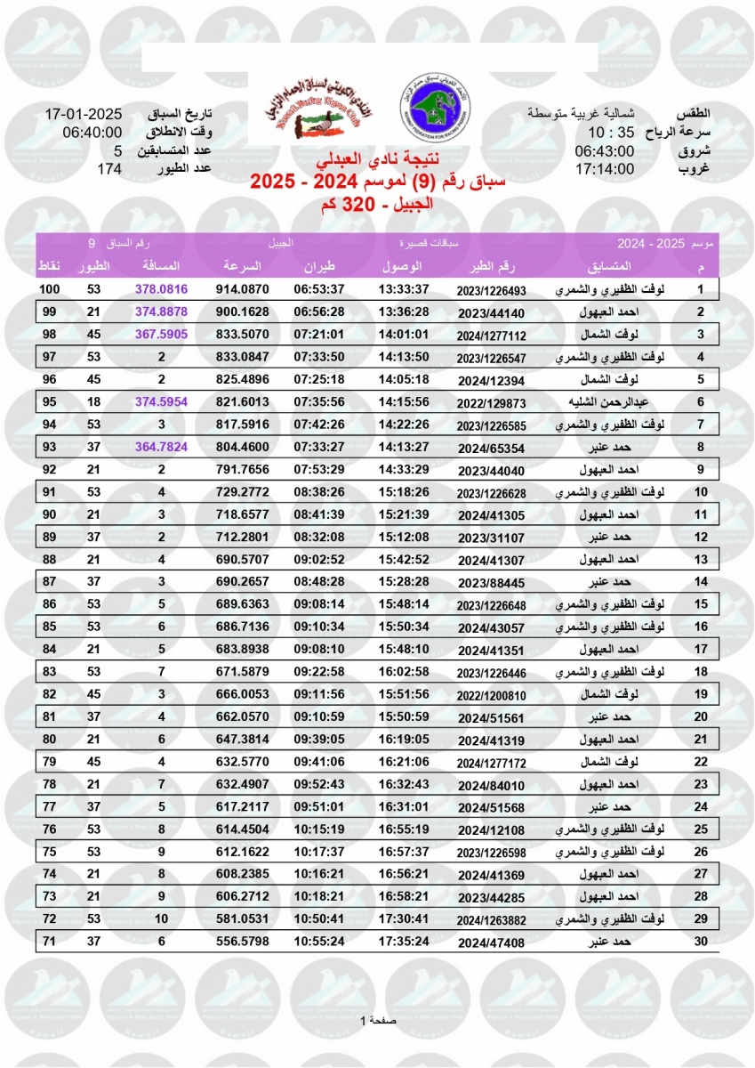 > منتديات الاتحاد الكويتي لسباق حمام الزاجل > منتدي اخبار السباقات > نتائج سباقات الاتحاد الكويتي / Race results > نتيجة السباق التاسع- الجبيل 320كم - نادي العبدلي