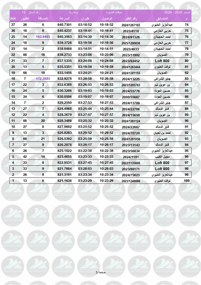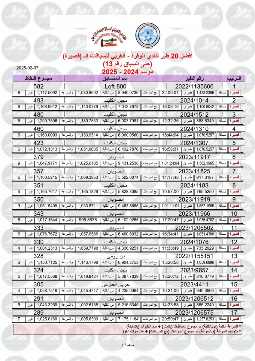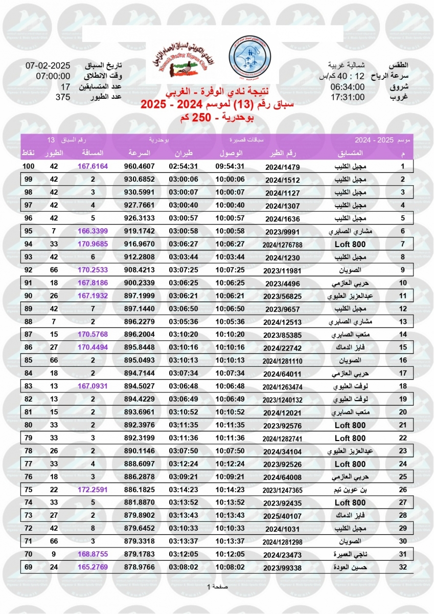 > منتديات الاتحاد الكويتي لسباق حمام الزاجل > منتدي اخبار السباقات > نتائج سباقات الاتحاد الكويتي / Race results > نتيجة السباق الثالث عشر - بوحدرية 250 كم - لنادي الوفرة غربي