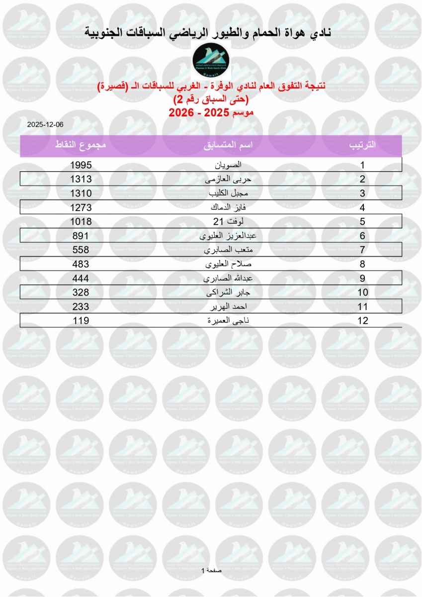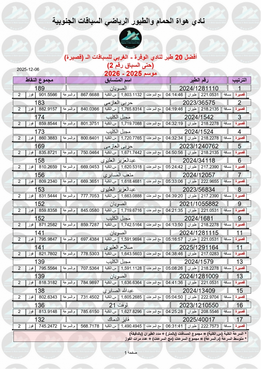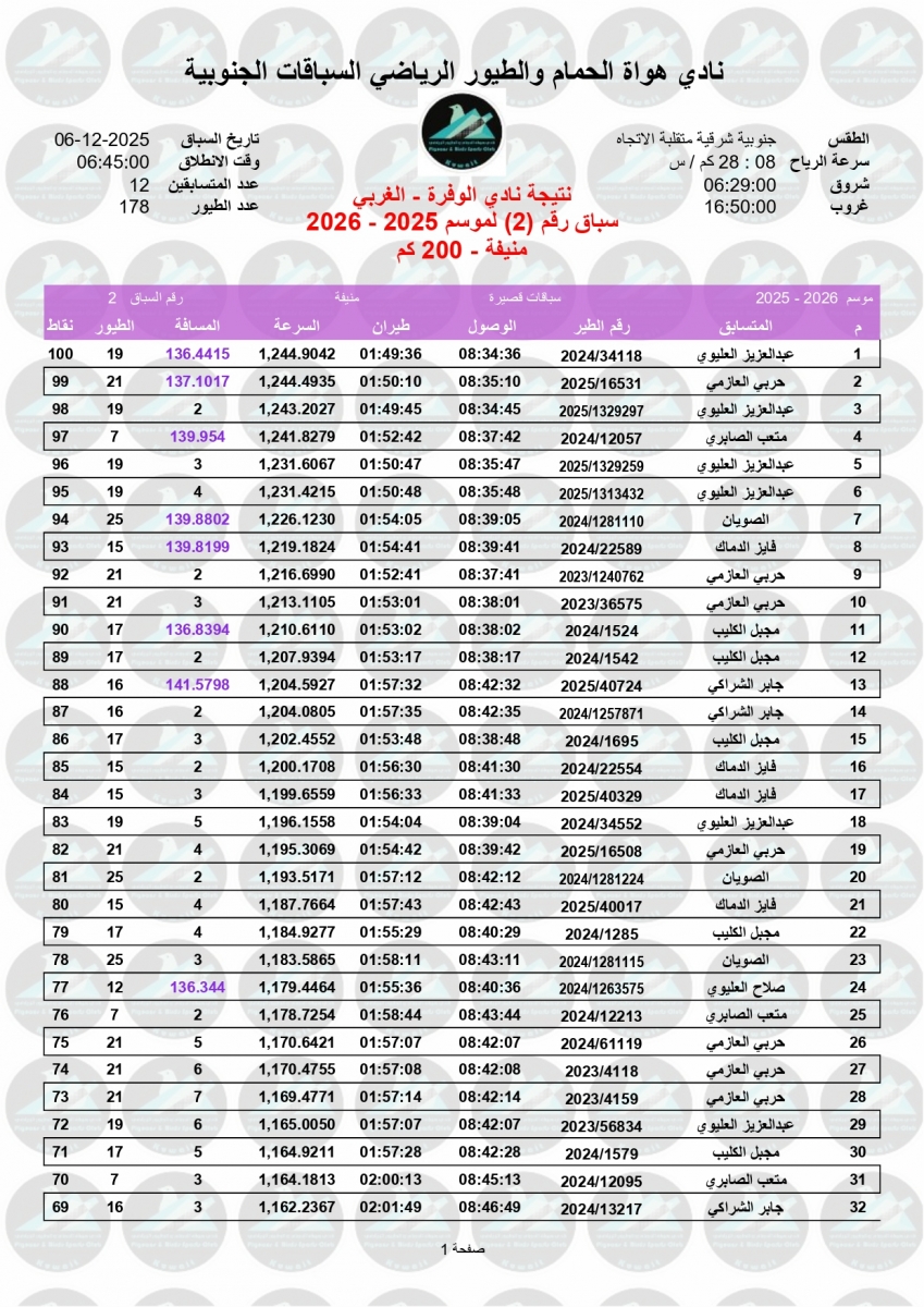 > منتديات الاتحاد الكويتي لسباق حمام الزاجل > منتدي اخبار السباقات > نتائج سباقات الاتحاد الكويتي / Race results > نتيجة السباق الثاني - منيفه 200 كم - لنادي الوفرة غربي