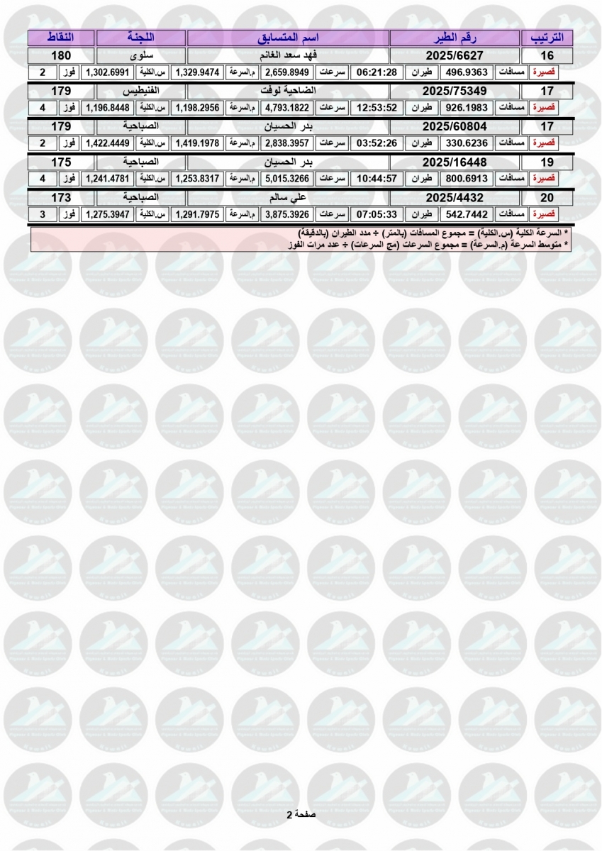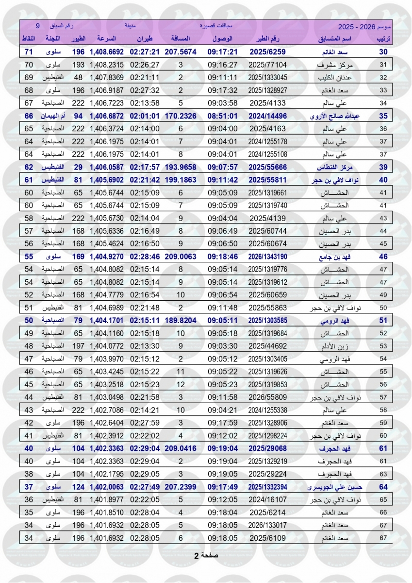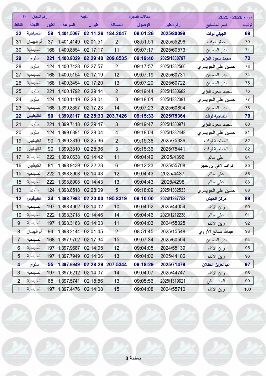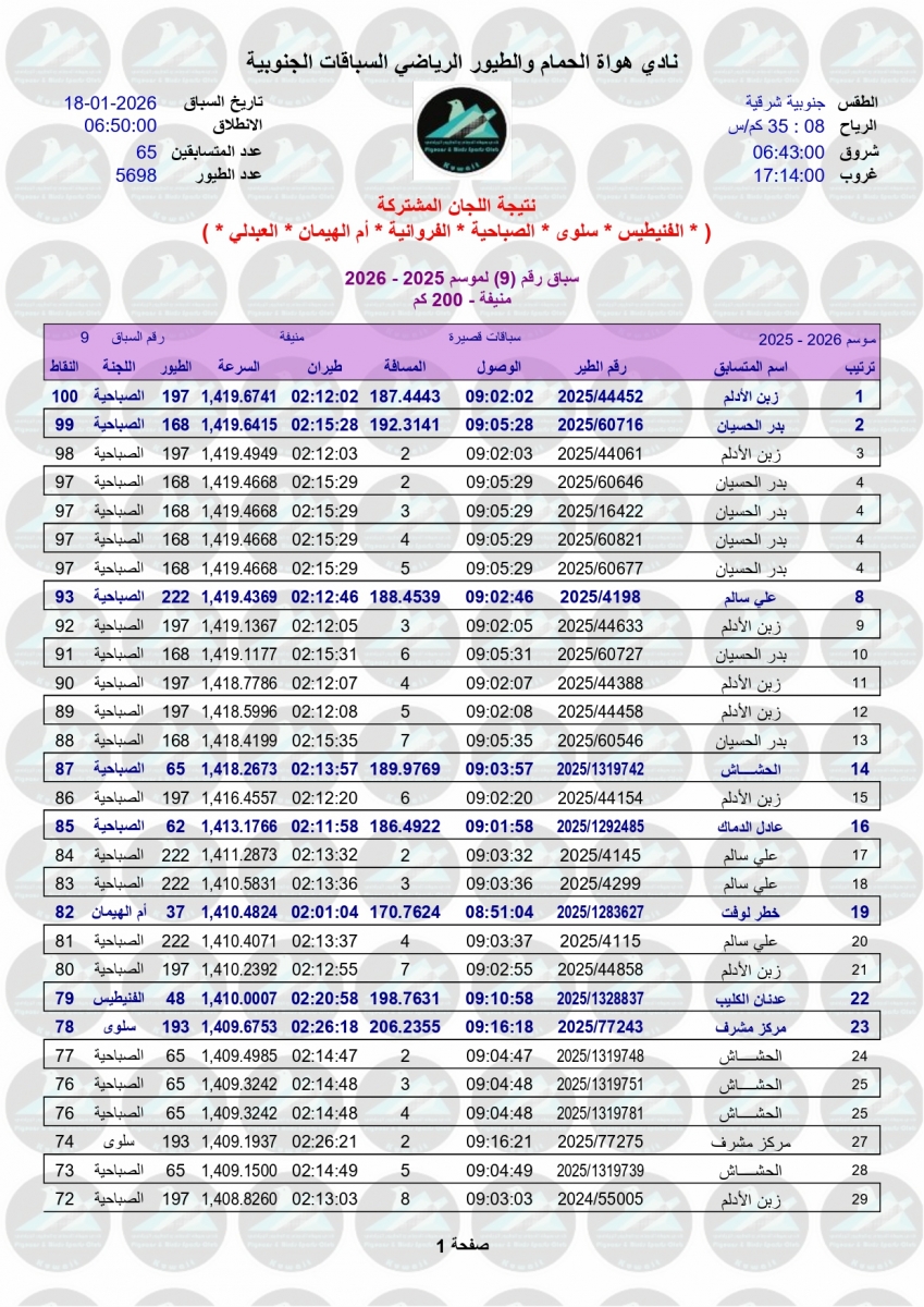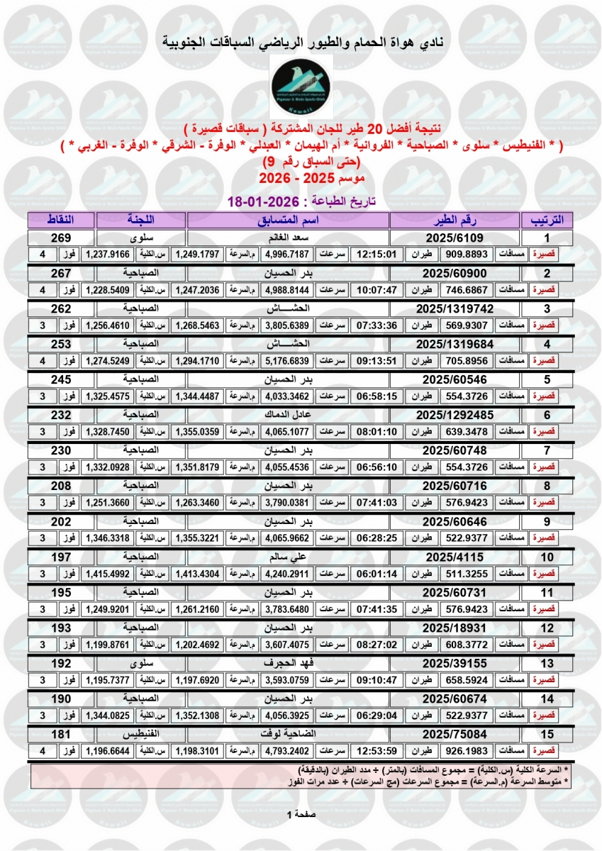 > منتديات الاتحاد الكويتي لسباق حمام الزاجل > منتدي اخبار السباقات > نتائج سباقات الاتحاد الكويتي / Race results > نتيجة السباق التاسع - منيفة 200 كم للسباقات المشتركة