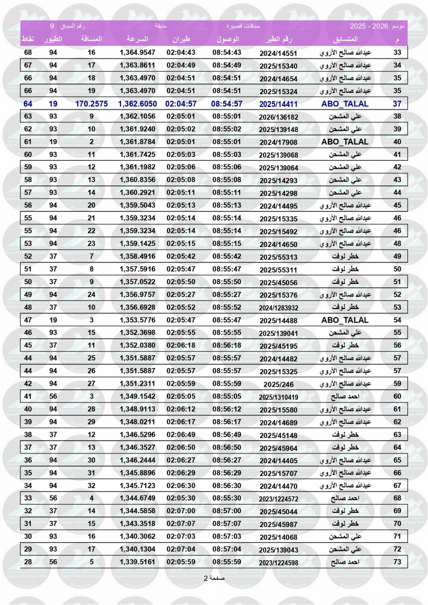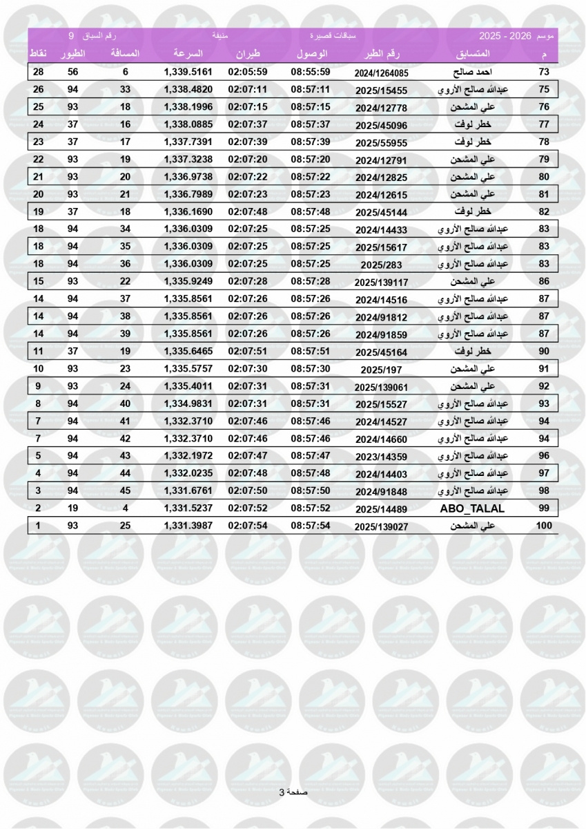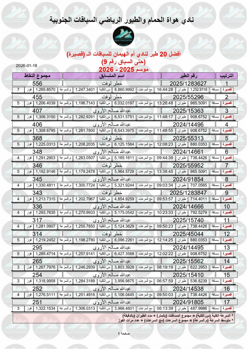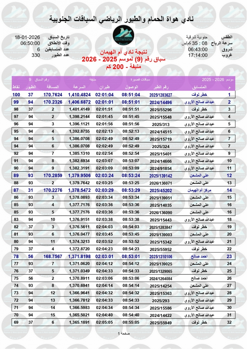 > منتديات الاتحاد الكويتي لسباق حمام الزاجل > منتدي اخبار السباقات > نتائج سباقات الاتحاد الكويتي / Race results > نتيجة السباق التاسع - منيفة 200 كم لنادي أم الهيمان