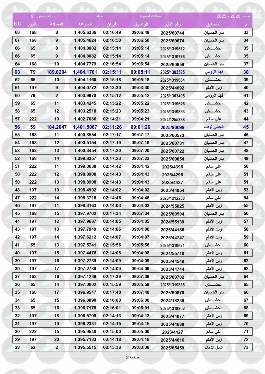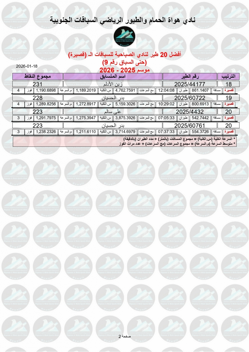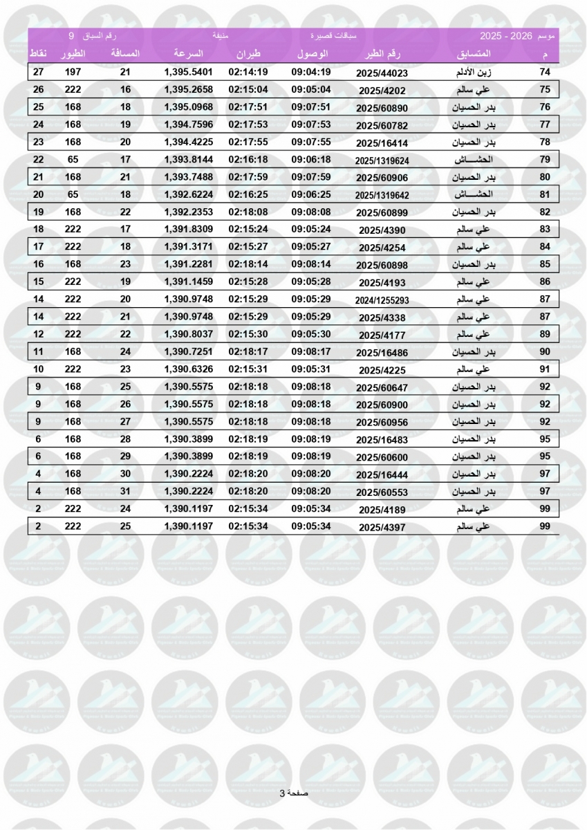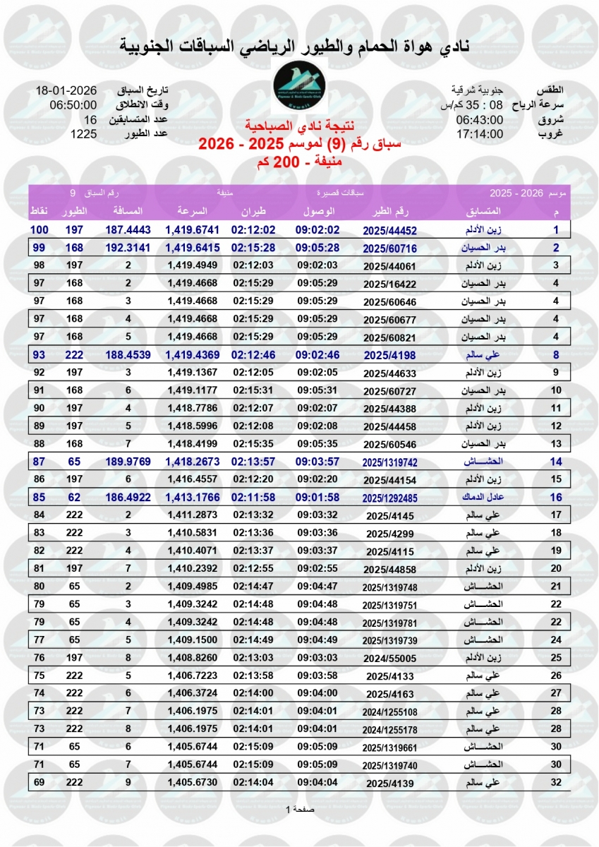 > منتديات الاتحاد الكويتي لسباق حمام الزاجل > منتدي اخبار السباقات > نتائج سباقات الاتحاد الكويتي / Race results > نتيجة السباق التاسع - منيفة 200 كم لنادي الصباحية