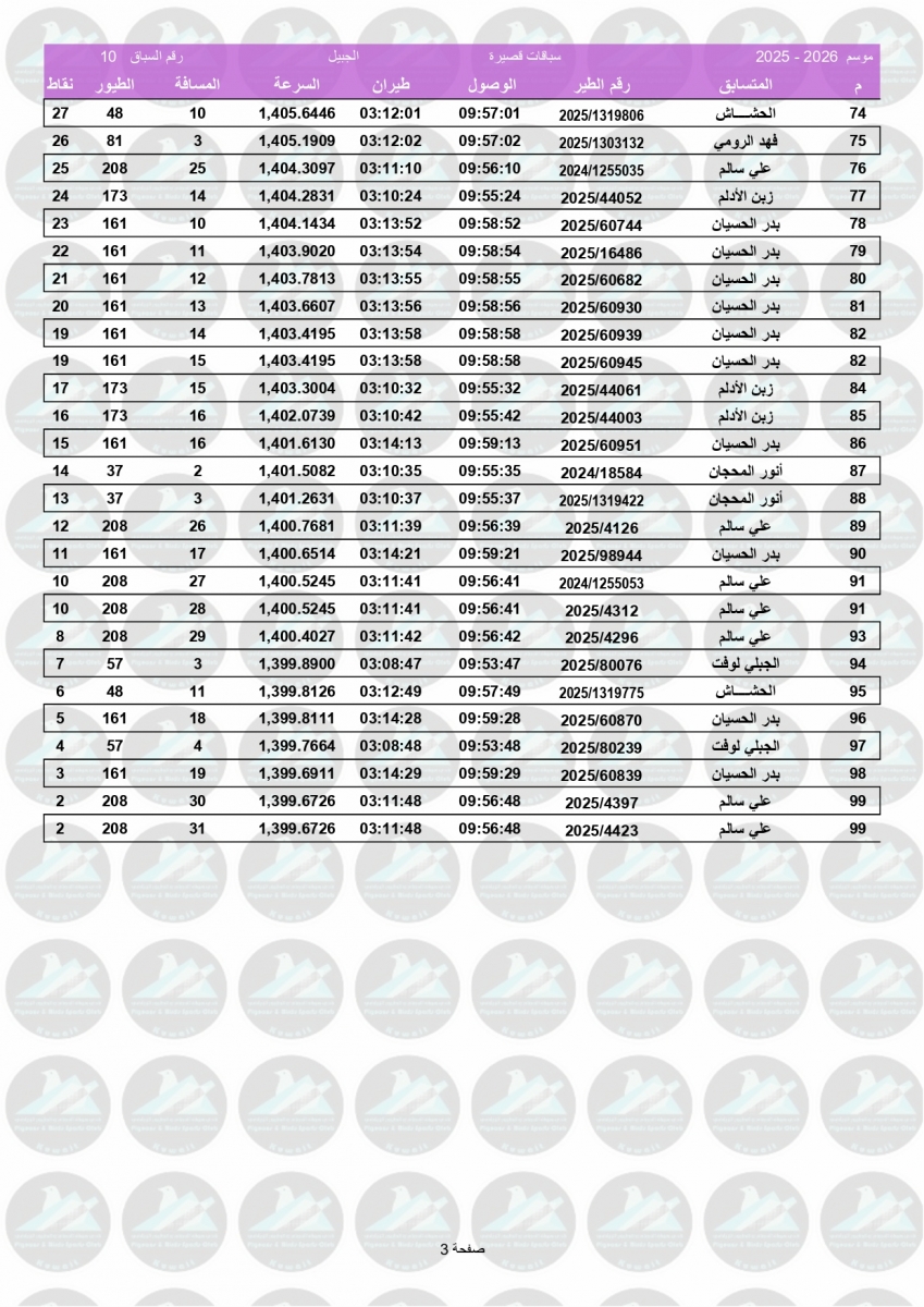 > منتديات الاتحاد الكويتي لسباق حمام الزاجل > منتدي اخبار السباقات > نتائج سباقات الاتحاد الكويتي / Race results > نتيجة السباق العاشر - الجبيل 320 كم - لنادي الصباحية