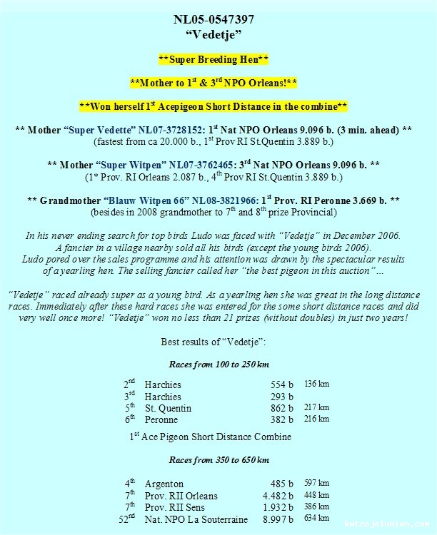 السادة أعضاء المنتدى الكرام تحية حب ومودة من القلب للقلب موضوعنا اليوم مع العمدة وكما أحب أن أطلق عليه عمدة الخليج وهذه ليست كناية جاءت من فراغ لكن من نتكلم عنه اليوم هو احد مؤسسي الزاجل في الكويت وهو ومن أبطال الكويت والعالم أيضاً ولنتحدث عن أخر أخبار العمدة (بدر السنافي) وما يمتلكه من سلالات عريقة وسلالات من أقوى وأغلى الحمام في العالم أمثال Ludo Claessens وحمام G. Koopman كما يمتلك حمام دايركت منJanssen الأقزام وحمام من البطل العالمي De Rauw Sablon أما عن كلامنا اليوم فهو عن طيوره من Ludo Claessens والذي لها شهرة عالمية كبيرة من حيث نتائجها الجبارة وأسعارها الكبيرة حيث وصل سعر أبن الطير (Supercrak Jinge ) إلى 110000 ألف يور فقط مائة وعشرة الأف يورو وهو ابن مباشر من Supercrak 69 وبسؤال العمدة (بدر السنافي) لماذا اتجهت إلى هذه السلالات أجاب بكل ترحاب أولا لابد لكل هاوي وعلى فترات من إدخال دماء جديدة للتنشيط ولكن بمقايس معينة واختياري لهذه السلالات وبعد دراسة متأنية ومن واقع نتائجها الجبارة وتصليح طيورها العالي لذا قررت الاستعانة بمثل هذه السلالات القوية والتي تعتبر قاعدة في لوفتات إبطال بلجيكا وهولندا .