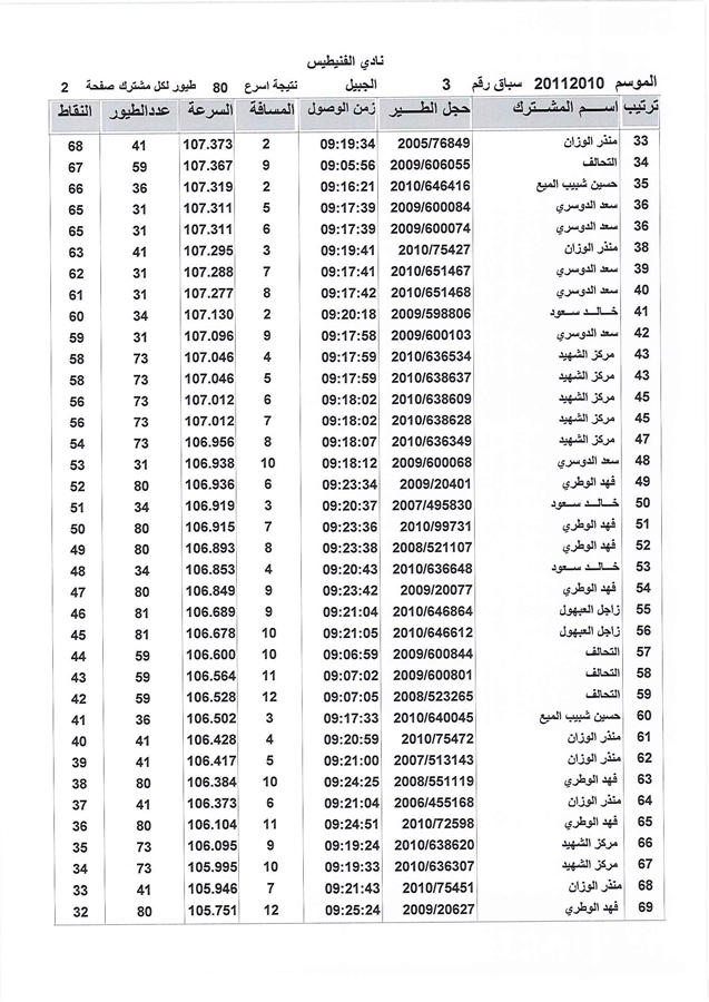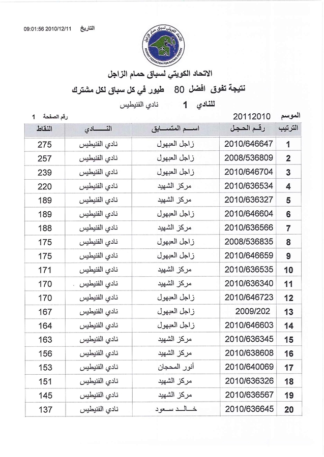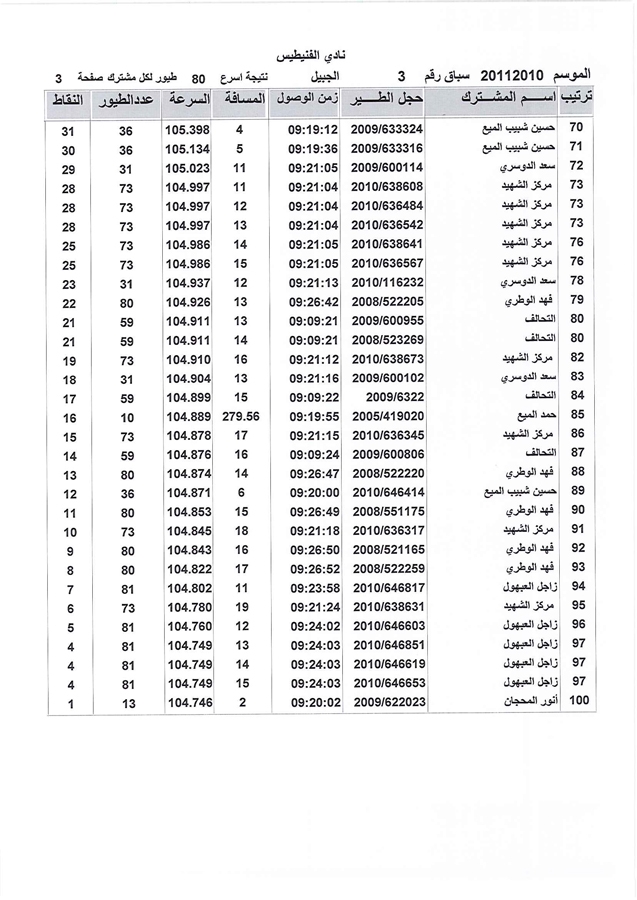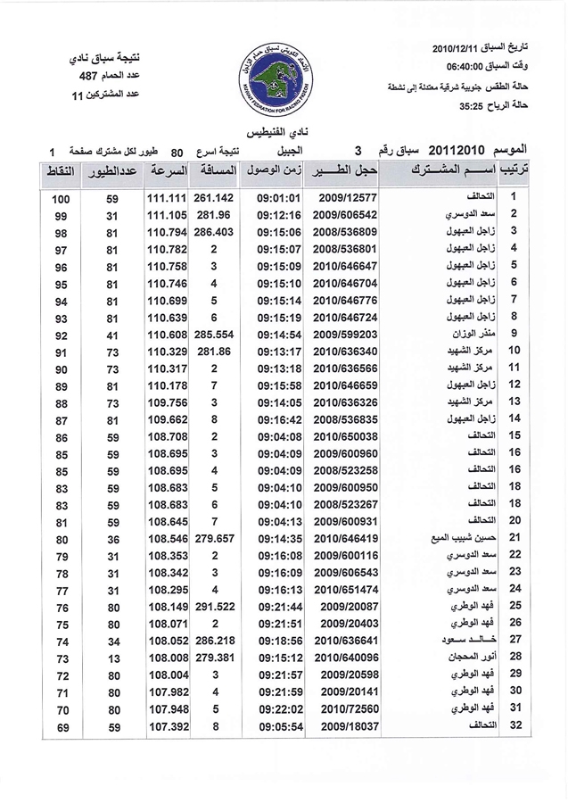 > منتديات الاتحاد الكويتي لسباق حمام الزاجل > منتدي اخبار السباقات > نتائج سباقات الاتحاد الكويتي / Race results > الفنيطيس 320 كيلو الجبيل السباق الثالث 2010/2011