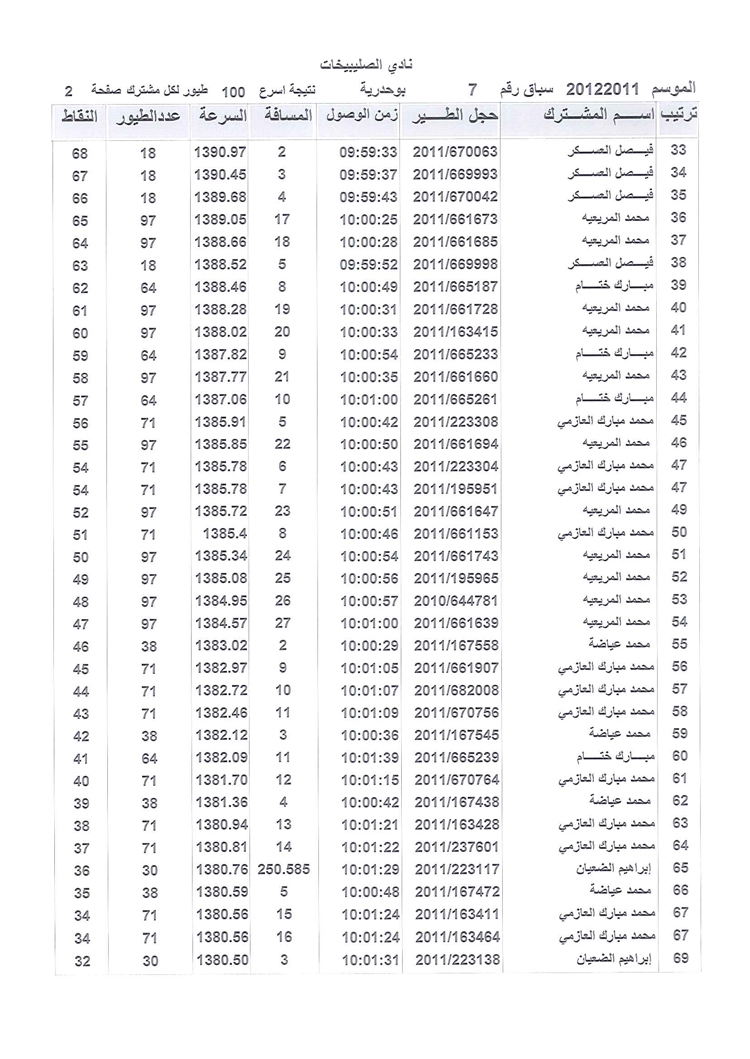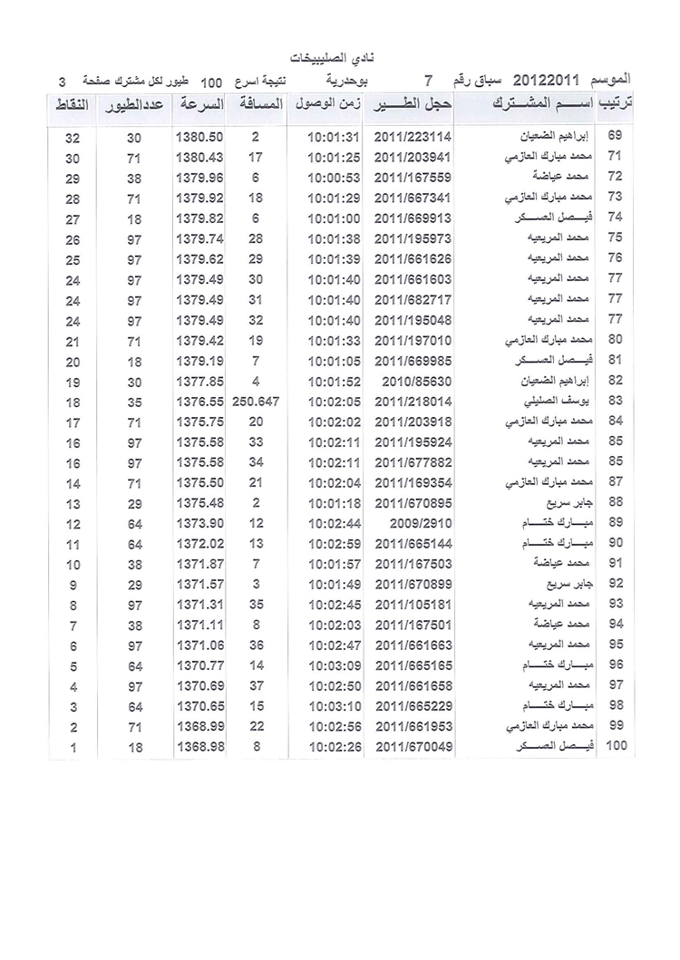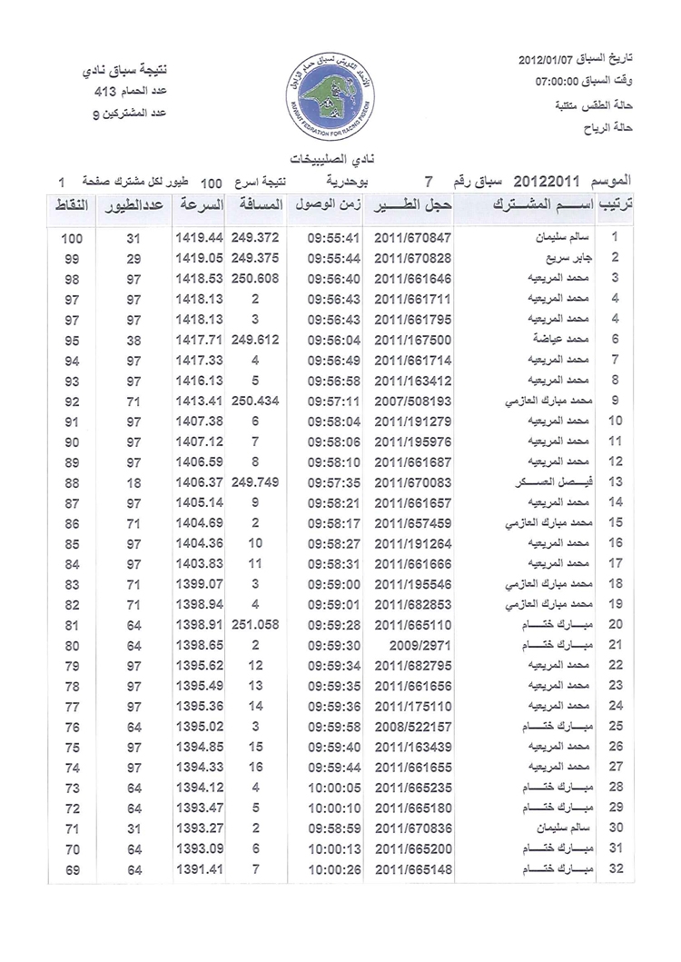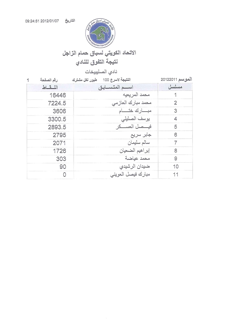 > منتديات الاتحاد الكويتي لسباق حمام الزاجل > منتدي اخبار السباقات > نتائج سباقات الاتحاد الكويتي / Race results > نتيجة الصليبخات السباق السابع موسم 2011/2012 بوحدرية (2) 250 كيلوا