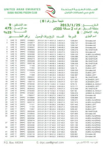 نرفق اليكم نتيجة السباق الثامن من منطقة عراده 300كم والمقام يوم الجمعه الموافق 25/1/2013م